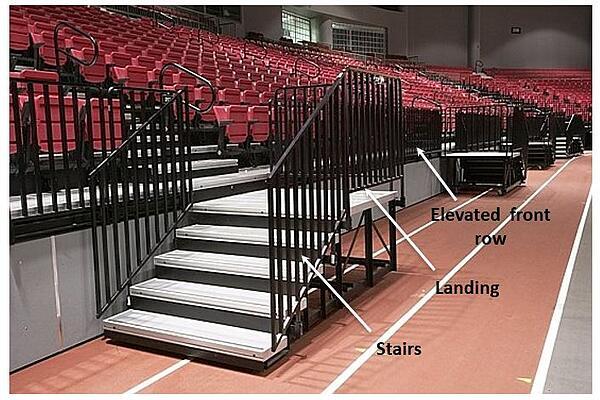 Aisle steps within an aisle are required when the row rise exceeds 8”. Intermediate aisle steps must be permanently attached and designed to eliminate any possible toe catch between the top of the intermediate step and the bottom of the nose beam, per ADA or other applicable codes. Front steps should be removable, and interlock to the front row during events to eliminate accidental disengagement.