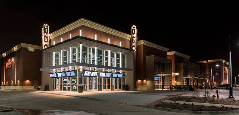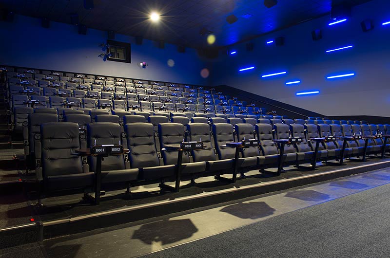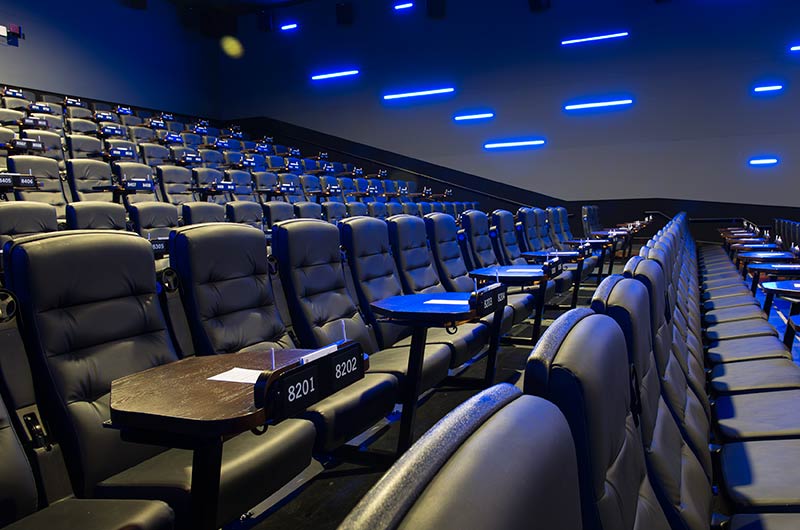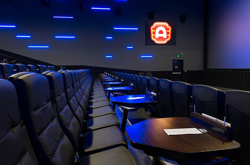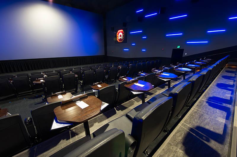 This cinema was built with eight theatres and installed with a custom Signature Rocker and table developed specifically for Alamo Drafthouse Cinemas. The seating is provided with black plastic and powder coat and CMI Illusion vinyl for easy cleaning and a luxurious feel. Chairs feature flip-up cupholder armrests and the tables are manufactured with concealed lights, menu holders, purse hooks and seat number identification block with pen holder.