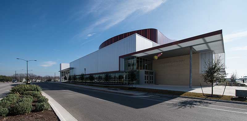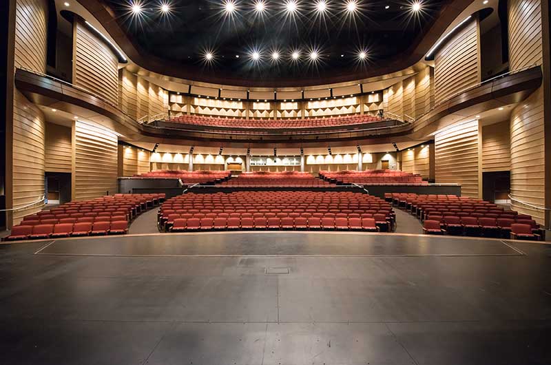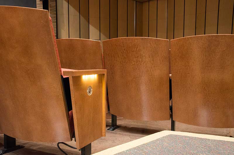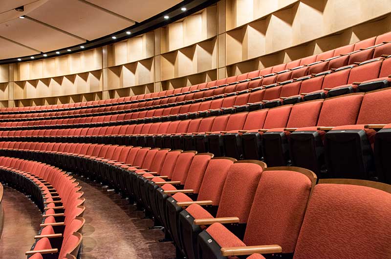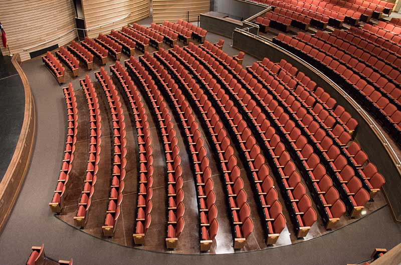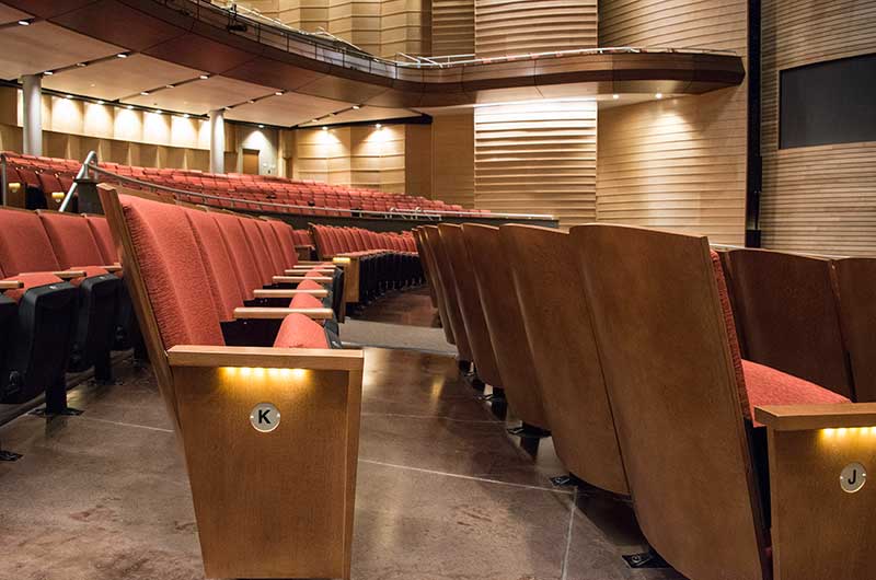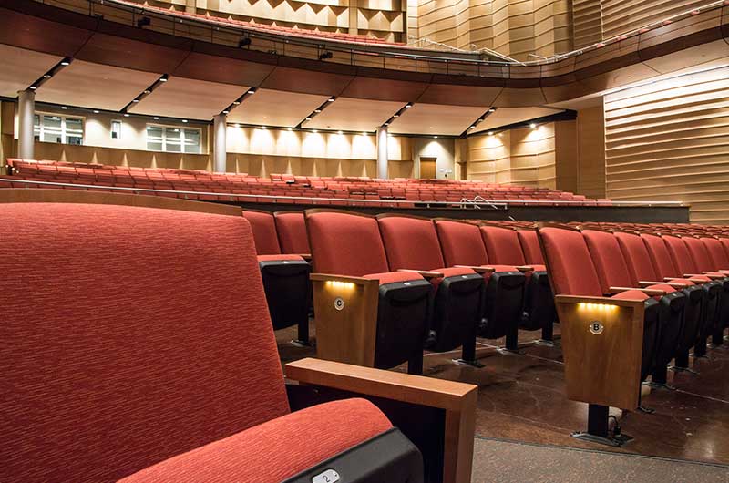 This beautiful facility opened in 2015 and serves the entire Austin ISD as well as the community which can rent the facility. The main theatre has 1,220 model 27.12.XX.8 custom Allegro chairs. The Custom ends feature concealed LED aisle lights and recessed row letter plates. The maple hardwood components are finished in No. 17 India Teak. Backs and seats are upholstered with Culp Fandango Apple fabric.