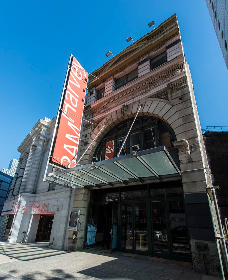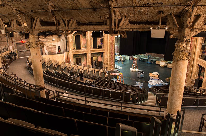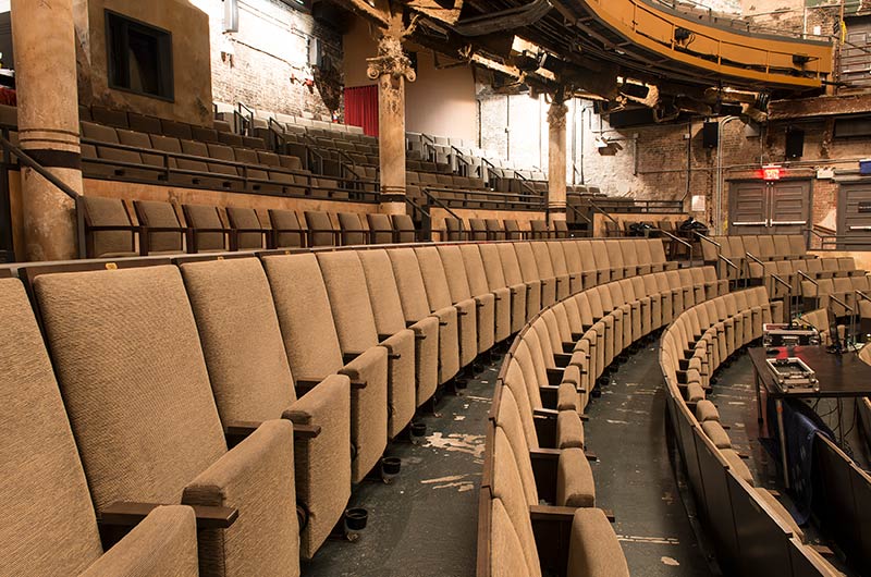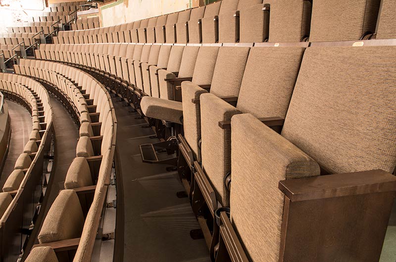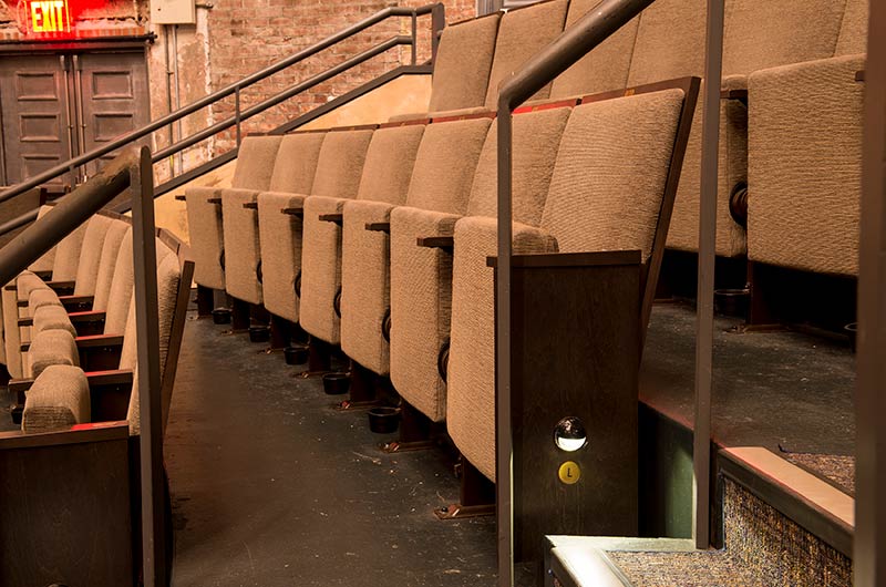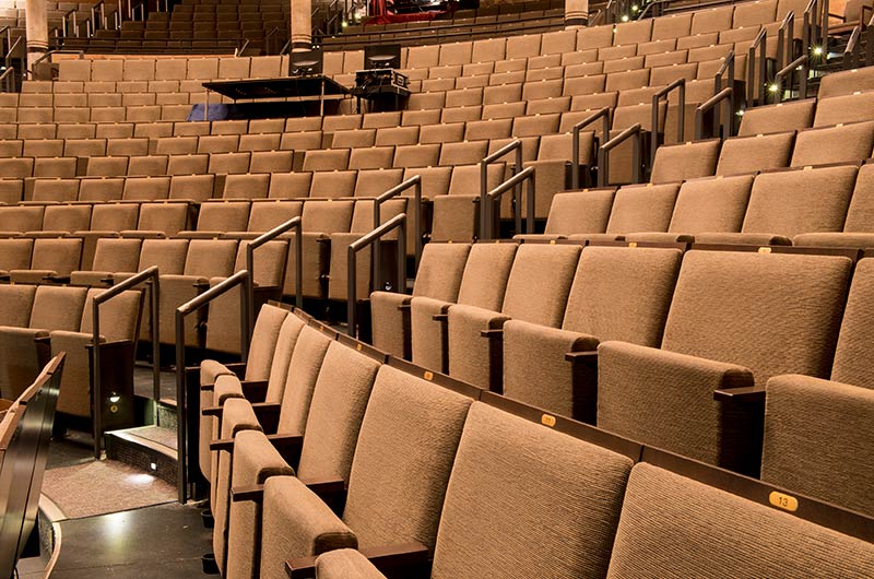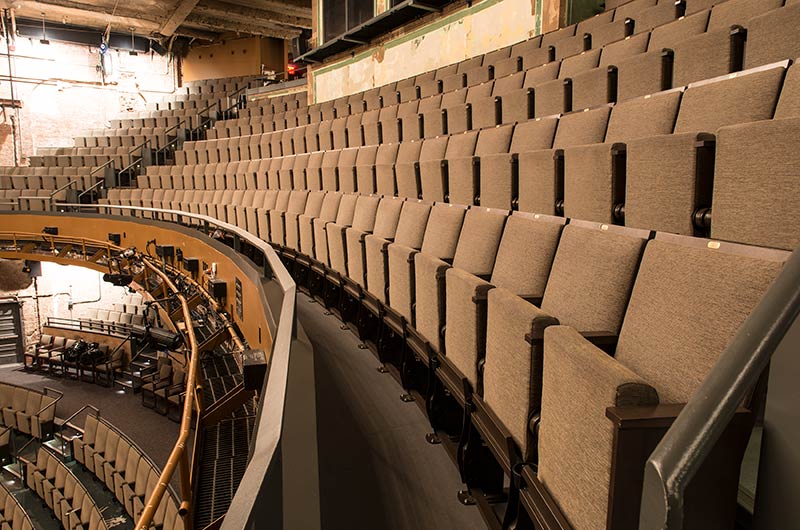 The Harvey is owned and operated by the prestigious Brooklyn Academy of Music. The theatre, originally known as the Majestic, opened in 1904. By the 1960s the theatre was closed and sat empty for a couple of decades before it was renovated and reopened in the 1980s with an award-winning, aged European design. Recently Irwin Seating provided new custom seating for the 800 seat Harvey. The chairs are modified Allegro chairs with fully upholstered gravity lift seats. To help improve sightlines, the balcony chairs are taller than a normal chair and feature an innovative footrest mechanism for comfort. These chairs are upholstered in Maharam Steady Cryton Summit fabric and finished with a custom wood stain and powder coat (paint). The seating also features a discreet center standard cupholder.