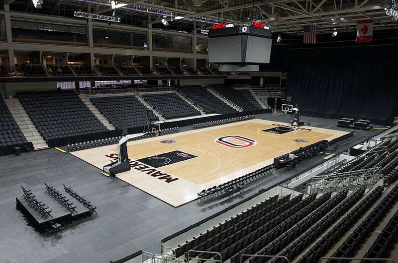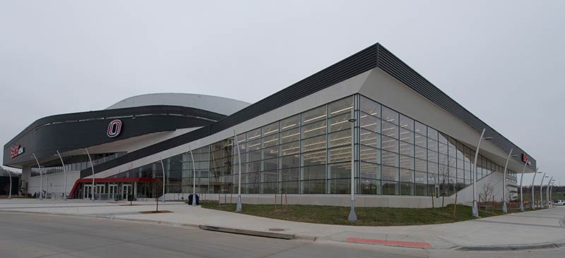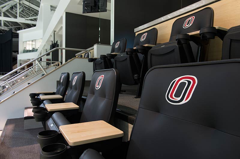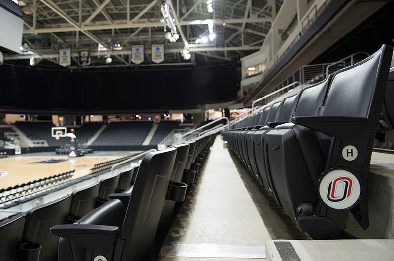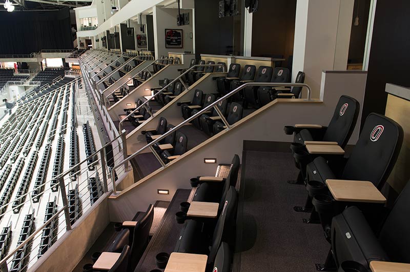 University of Omaha's Baxter Arena is a 7,500 seat facility that serves as a home for the University's hockey, men’s and women’s basketball and volleyball teams and campus recreation. In addition, the arena provides the community a venue for concerts, civic events, youth hockey, figure skating and curling. General and club seating areas are installed with 90.12.00.4 Citation chairs while the suites feature model 51.12.10.4 Marquee with intermediate drink tables. One end zone is supplied with model 4500 telescopic bleachers with Infinity Seat Modules that can be closed for certain events. All Citation and Marquee chairs are upholstered with CMI vinyl fabric with the club seating provided with 5-1/4" screen printed logos. Suites feature embroidered logos.