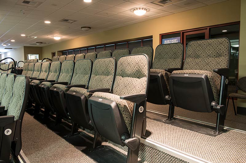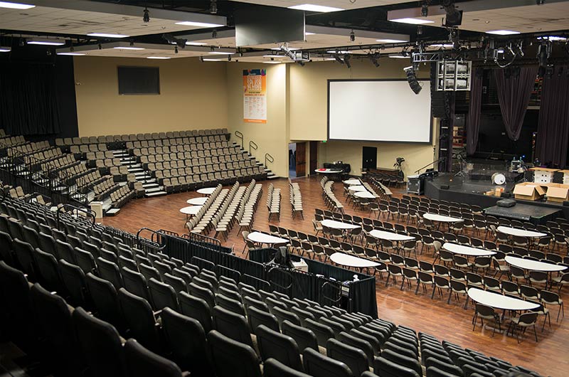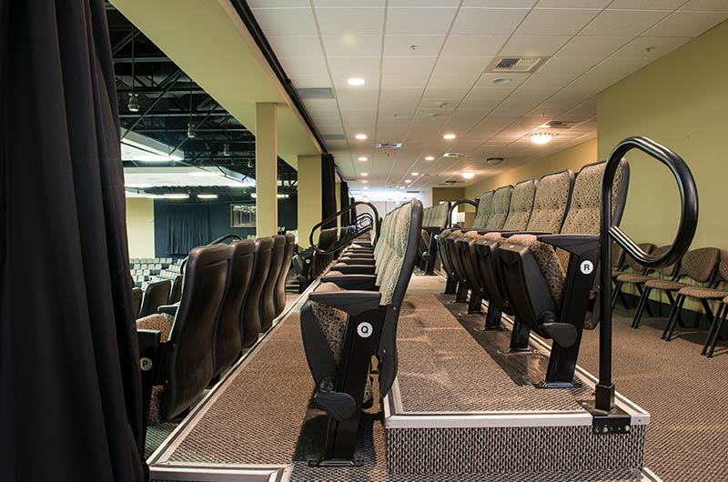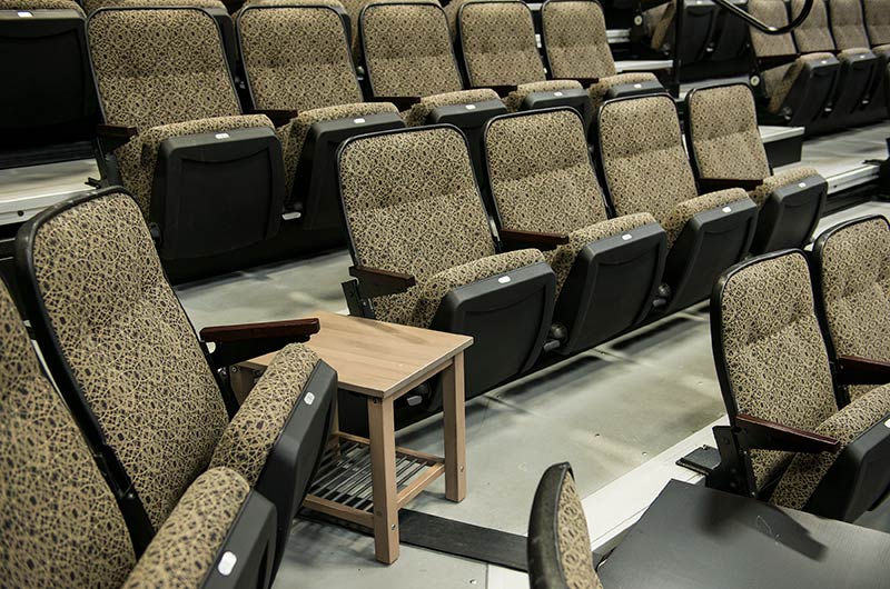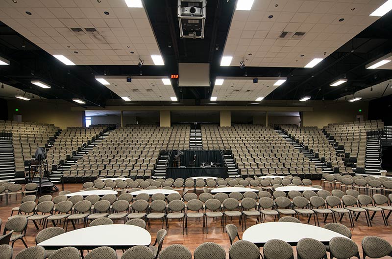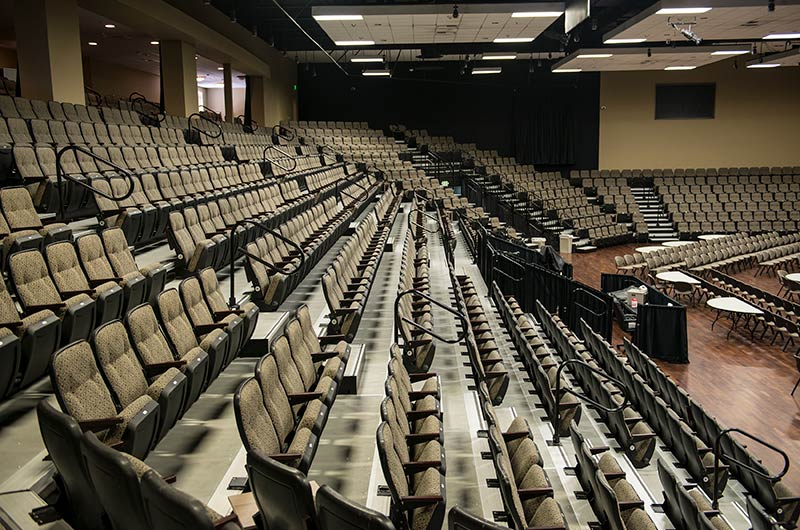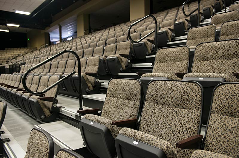Bayside's Blue Oaks Campus is installed with more than 1,500 nose-mount Marquee chairs on tapered, model 5000 telescopic platforms. In addition to the nose-mount chairs, there are a few rows of Model 51.12.00.4 fixed Marquee chairs for a consistent look. The platform system is designed with vomitories for access in and out of the space. The backs and seats are upholstered with a COM fabric.