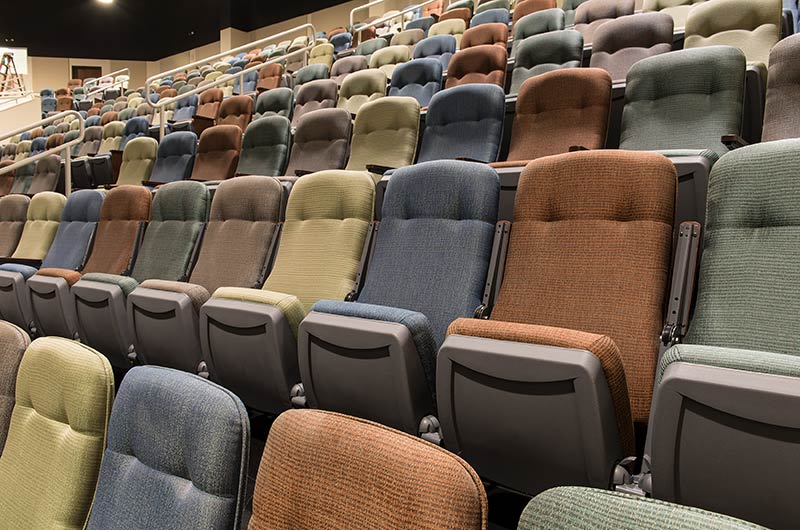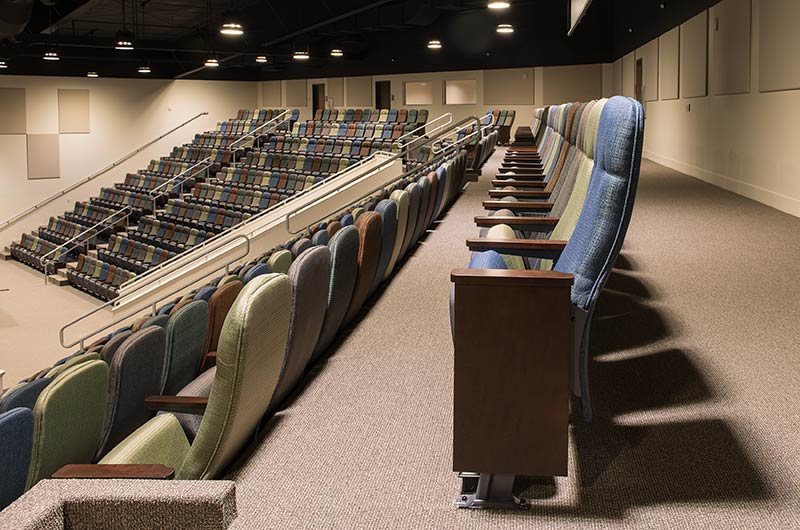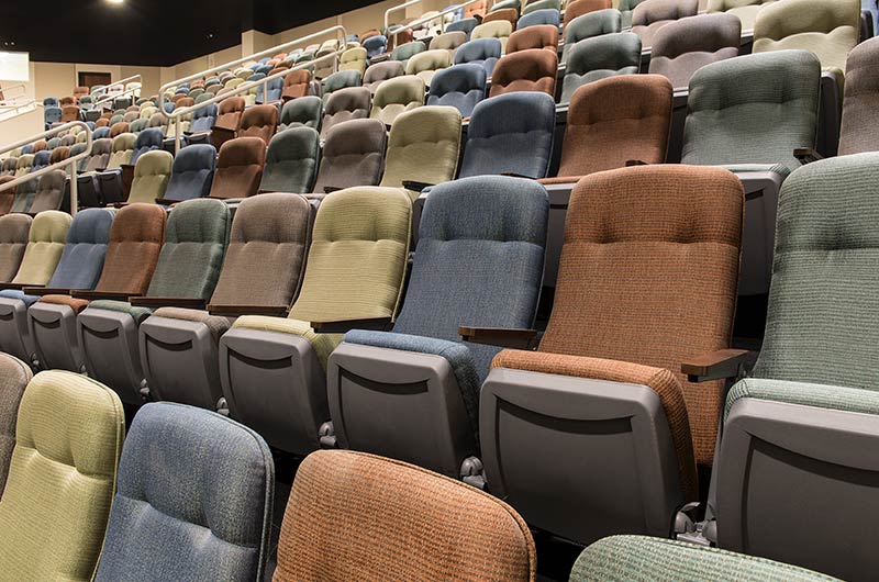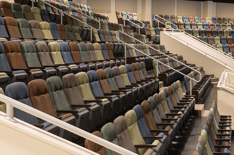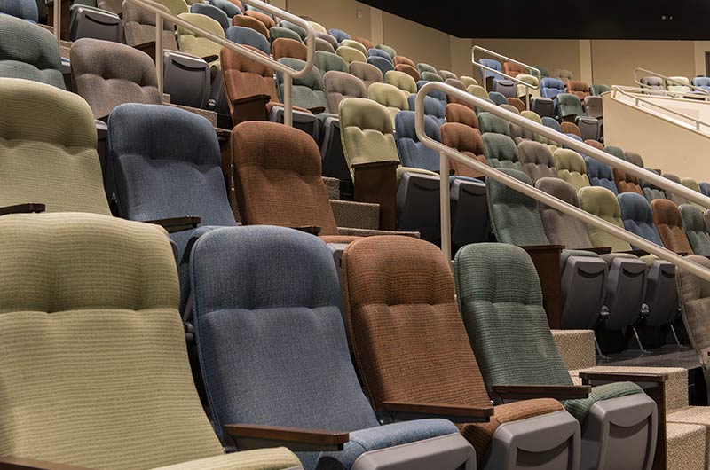 This comfortable and more engaging sanctuary has 748 model no. 89.12.60.44 Fellowship chairs provided in five colors of Designtex Bliss fabric. Backs are fully upholstered and the aisle end panels and armrests are stained in our No. 24 classic walnut on maple. The no. 44 chair platform is equipped with center flip-up center armrests.