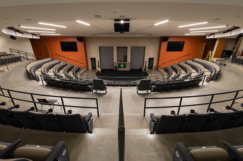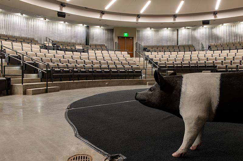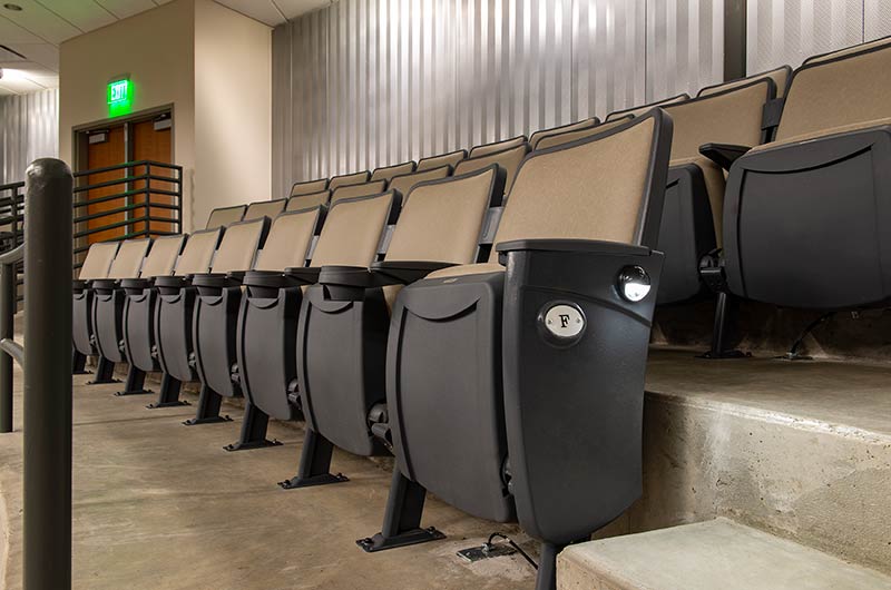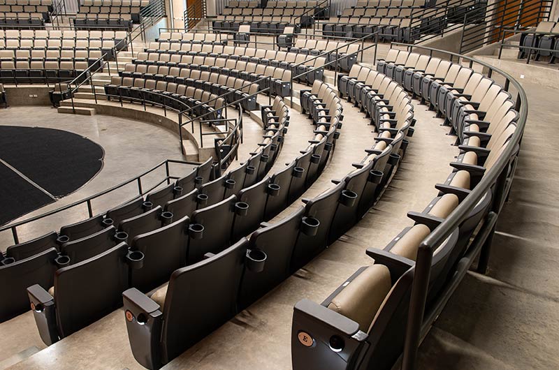 The Briscoe Carpenter Livestock Center is located on the grounds of the Texas State Fair and is used for showing and judging livestock. The showing area includes 300 model 90.12.20.4 Citation chairs from Irwin Seating Company. The seating is supplied with LED aisle lights attached to the cast iron aisle standards that feature a bevelled row letter plate landing, comfort curved polymer armrests and cupholders. The seating was finished with Charcoal Grey plastic and powder coat (paint) and upholstered with Brisa Fresco leather.