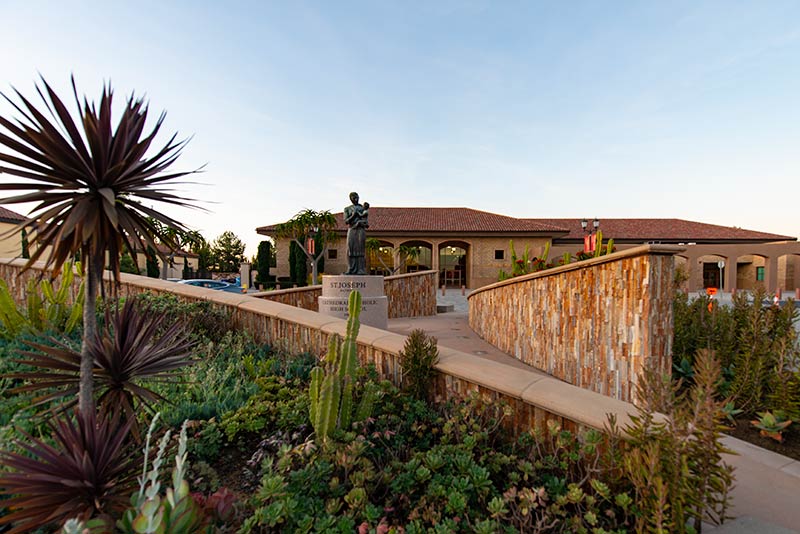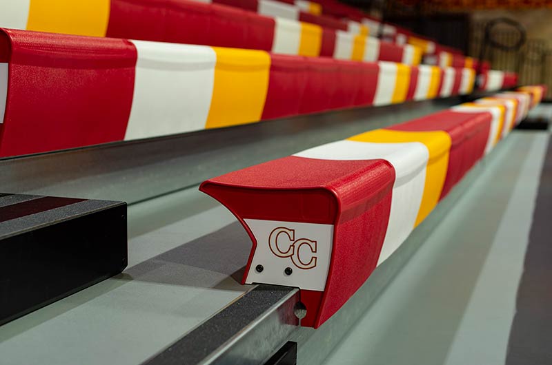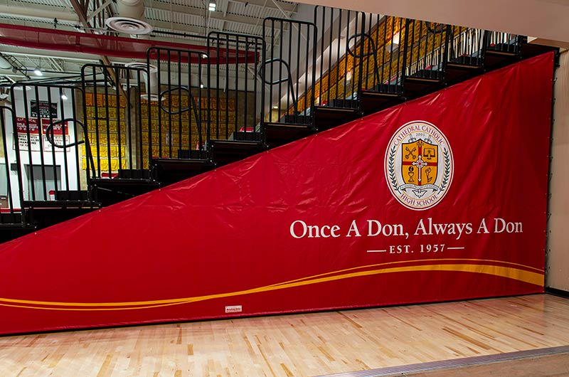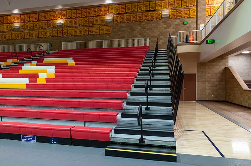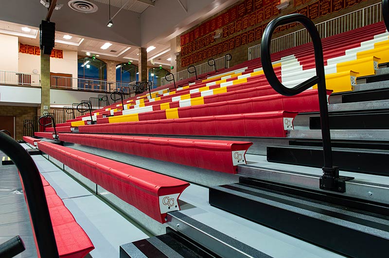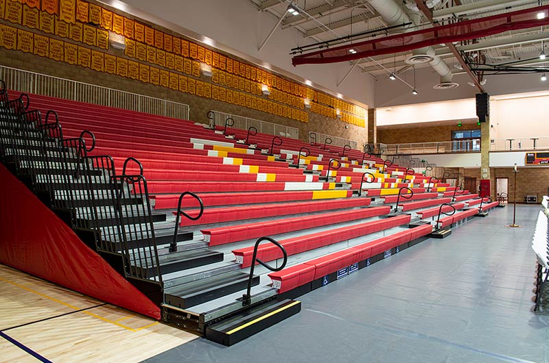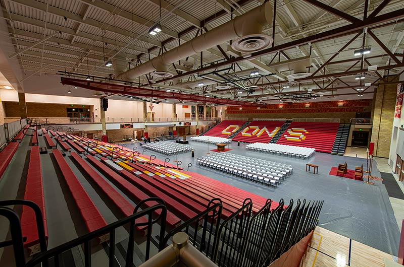 This beautiful school replaced their bleachers in 2018 with a VersaTract Telescopic System from Irwin Seating Company. The system was provided with more than 1,800 Infinity Seat Modules in three striking colors, Smart Rails and side curtains with screen printed logos on them. The day these photos were taken the gym was set up for Liturgy.