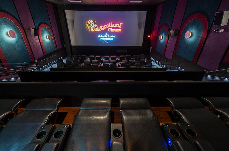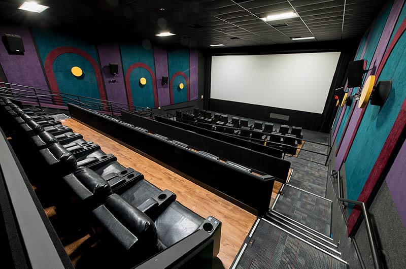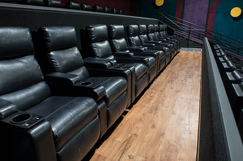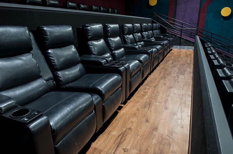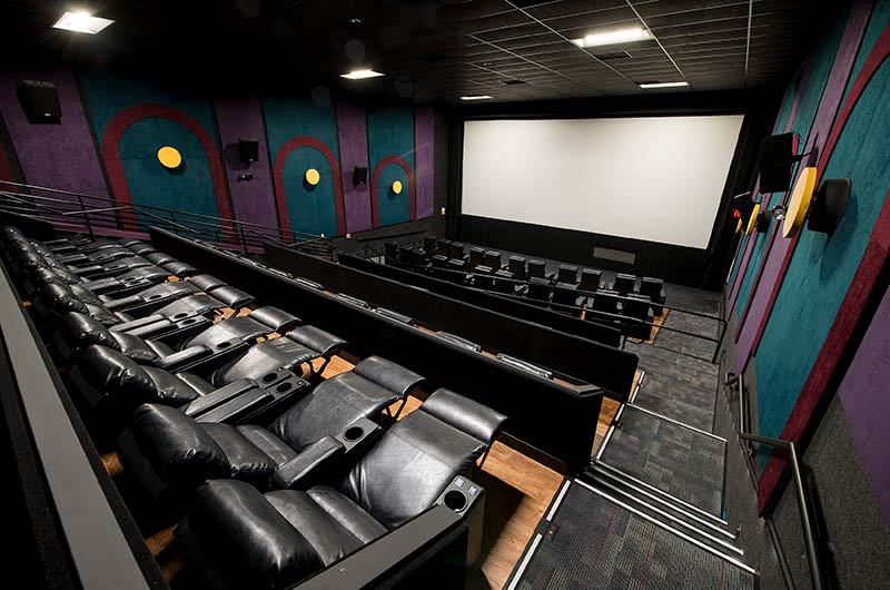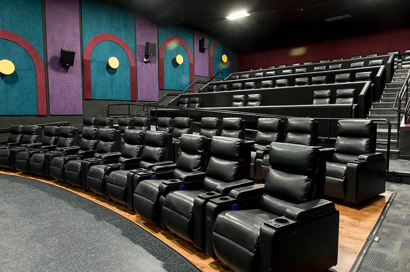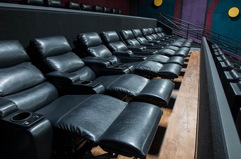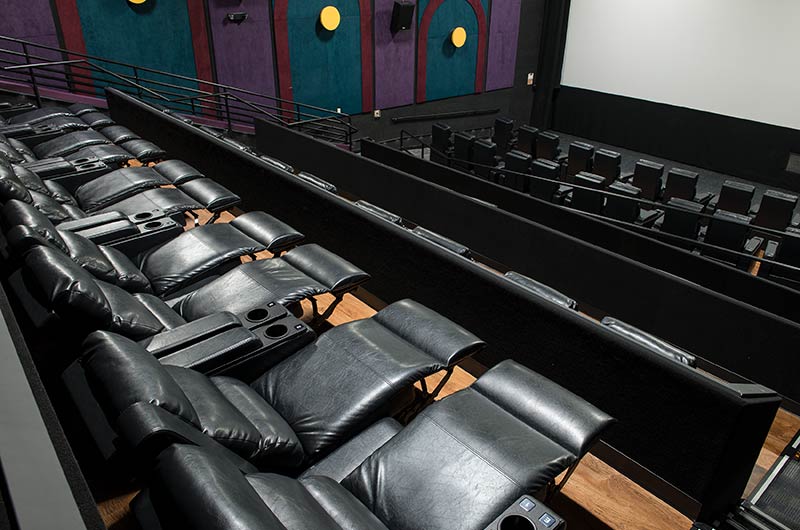 A renovation to this multi-plex in 2017 included the installation of new Spectrum Recliner chairs from Irwin Seating Company. The Eclipse model recliner's feature flip-up center armrests, padded, vinyl-wrapped arm caps with cupholders. As shown, the Eclipse Spectrum Recliner features a fully upholstered "chaise lounge" cover for an attractive, finished appearance. The seating is upholstered with Culp Yosemite raven.