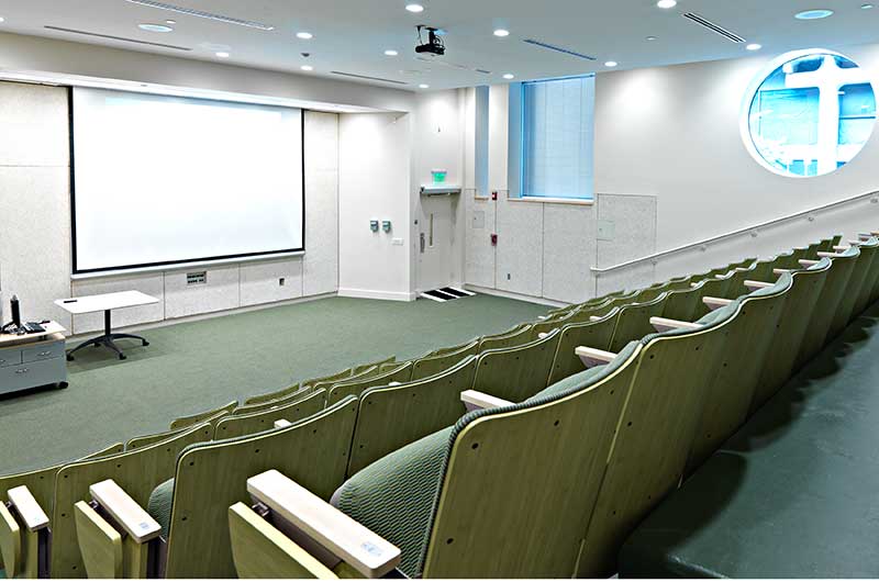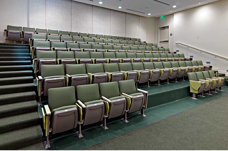 Irwin Seating provided model 8.12.86.4 Meteor chairs for two rooms at this school in Connecticut. The theatre has 285 chairs in a custom Maharam fabric, and the large group instruction room is installed with 79 chairs in another Maharam fabric.