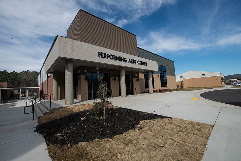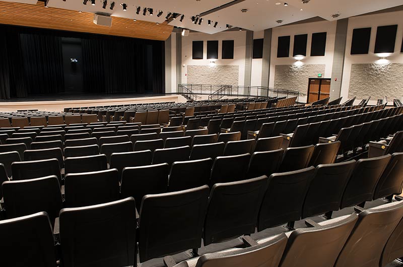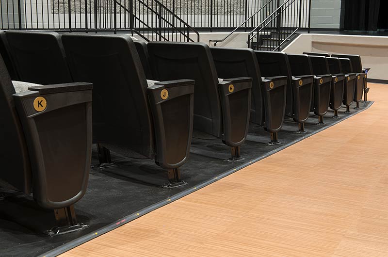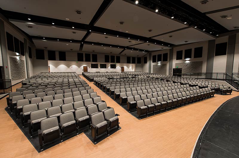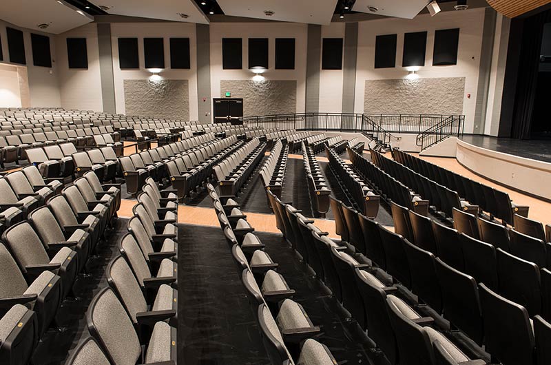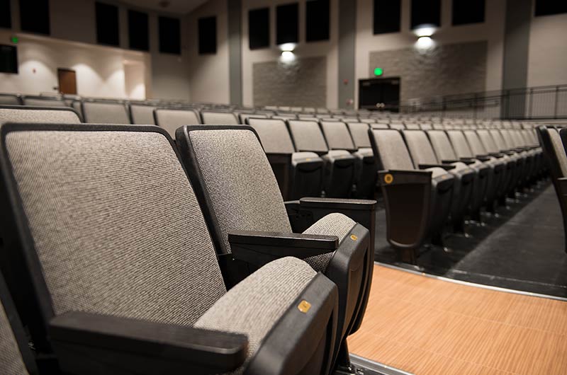 Coosa High School opened in the fall of 2016 that included a beautiful 705 seat performing arts center. The auditorium has great sightlines with the angled side banks and a perfect chair stagger for the center bank of chairs. The Irwin Seating model 90.1210.4 Citation chairs feature the No. 10 aisle end standard with a laminate surfaced insert panel and the No. 12 seat with a serpentine spring/cushion assembly for a traditional, very comfortable "ride." The chairs are finished with black plastic and powder coat (paint), the aisle insert panel is surfaced with Nevamar Jett Black laminate and the solid red oak armrests are finished in No. 2 Ebony. Backs and seats are upholstered with Absecon Mills Shire Black Marble fabric.