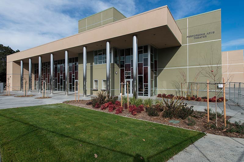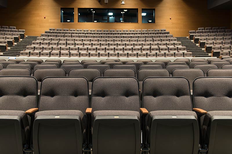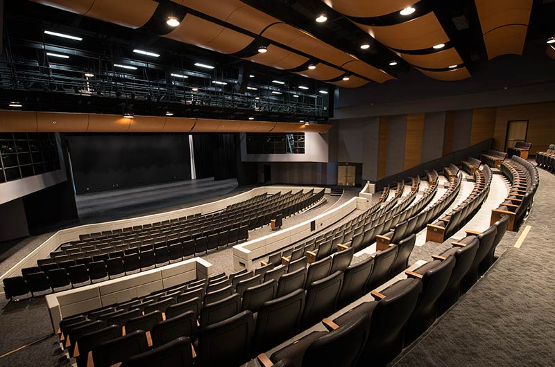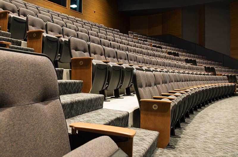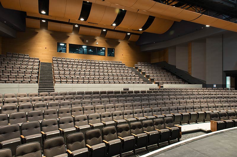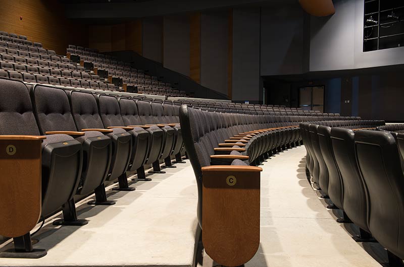 A new performing arts theatre was built for Cordova High School in 2015 and includes 457 model 51.12.66.4 Marquee chairs. The chairs are upholstered with Absecon Mills Shire Stable fabric and wood components are stained with No. 17 India Teak. Seating is provided with comfort curved wood armrests, concealed LED aisle lights, bronze number and letter plates and foot shrouds.