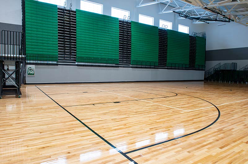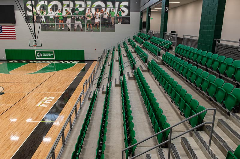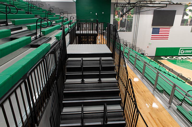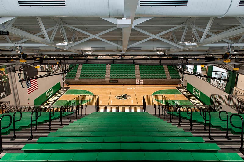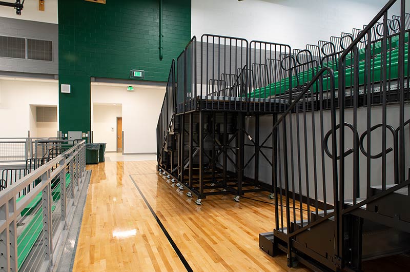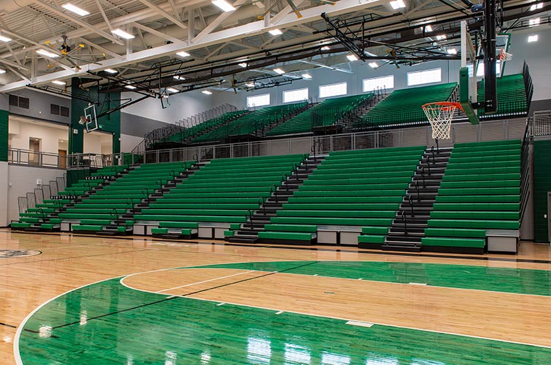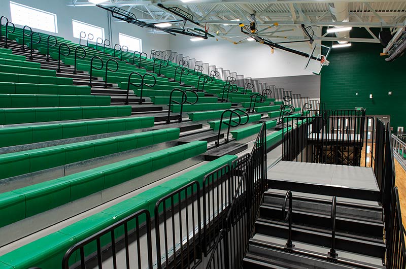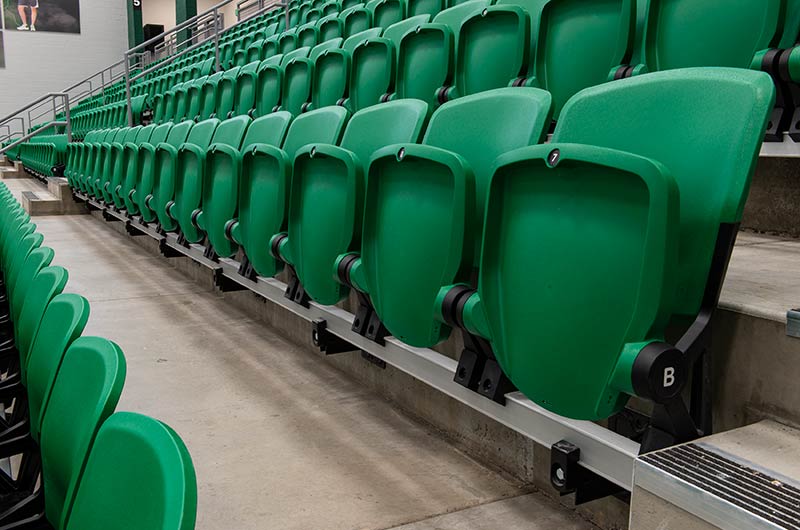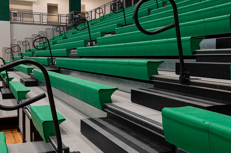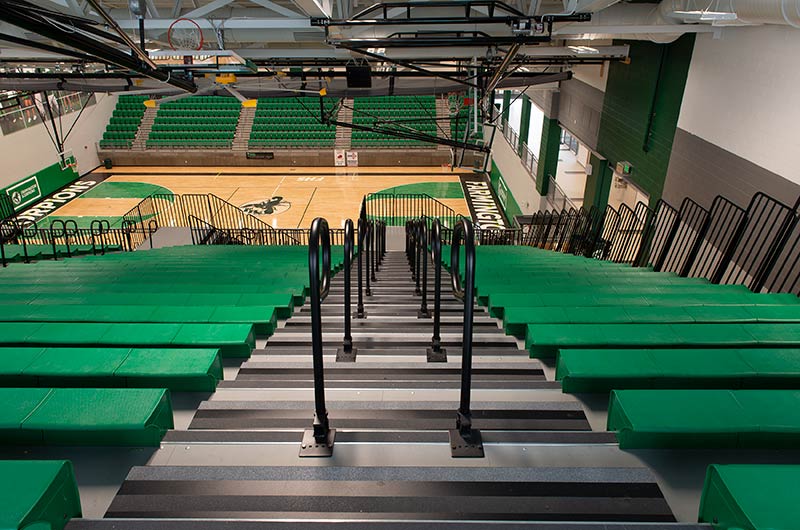 The main floor for this stunning gymnasium consists of 420 model 115.115.5.15 beam mount Solara chairs on one side and a 15-row telescopic system on the other. This group was designed with a custom row rise to meet rear row access and includes 700 Infinity Seat Modules in custom green. The balcony is equipped with a 21-row telescopic system with 900 Infinity Seat Modules. This system includes an elevated first row to ensure good sightlines of the court. To accommodate the elevation four rolling stair units were designed to provide access to the seating.