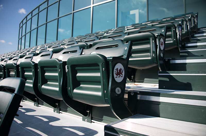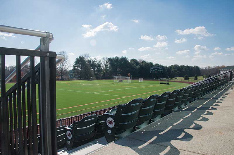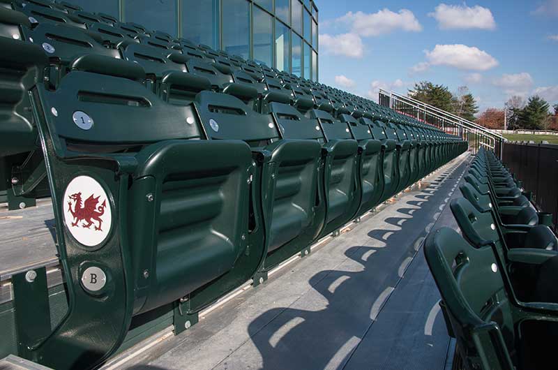 216 model 39.45.35.35 Senator chairs from Irwin Seating Company mounted to aluminum bleachers provide parents and faculty a great view of the action. The seating is provided with rear mount cupholders and aisle end standards with screen printed logo plates.