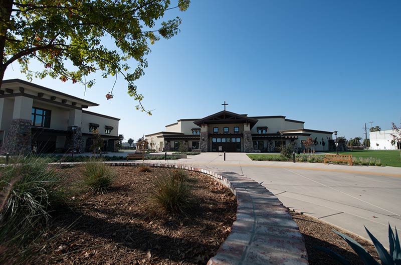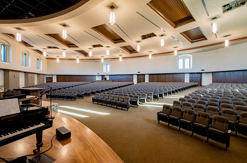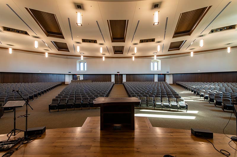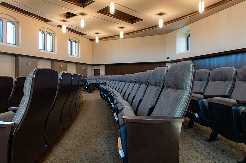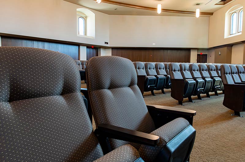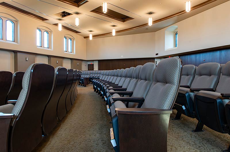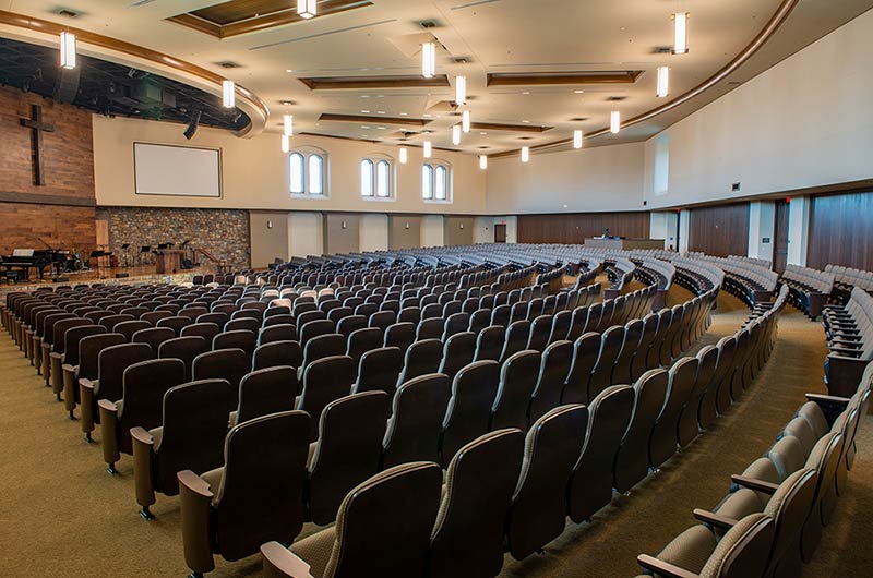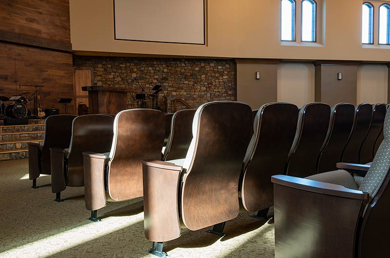 Kingsburg is located in central California's fertile farm country and is famous for its grape and raisin production. This beautiful church is installed with close to 1,100 model 89.12.34.44 Fellowship chairs. These chairs feature gorgeous compound curved wood backs, under-seat book boxes and center armrests that flip-up to next between the backs. Finished with black plastic and powder coat, the Maple backs and arms are stained with No. 24 Classic Walnut and the upholstery is Absecon Mills Paragon Putty.