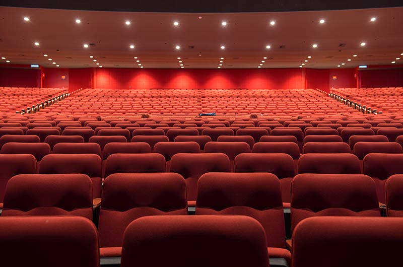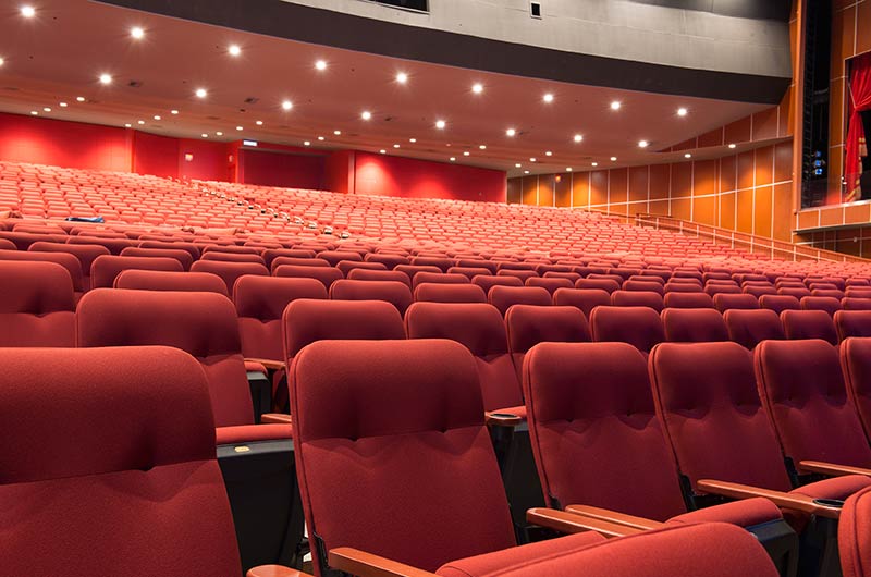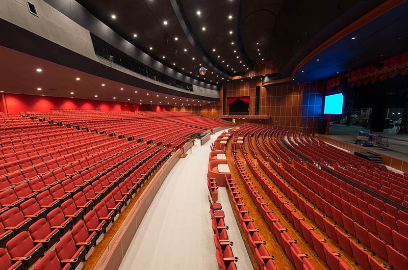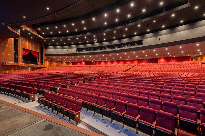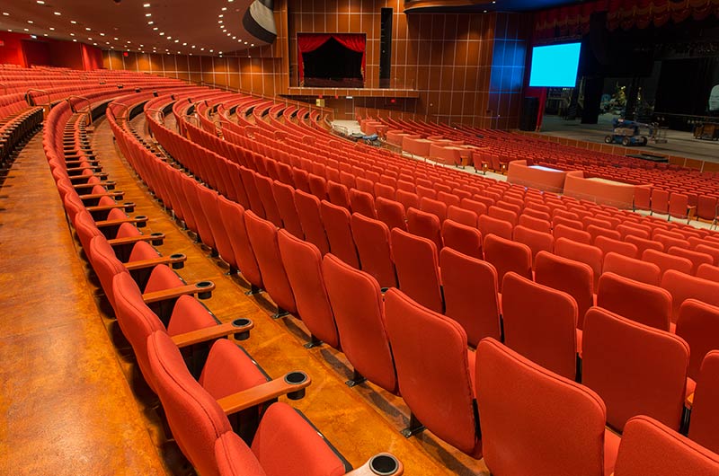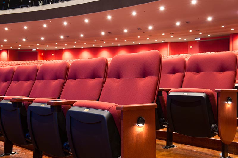 A $10 million dollar renovation to the Grand Theatre at the Grand Sierra Resort and Casino included 2,600+ 53.12.66.8 Marquee chairs. The backs are fully upholstered with Guilford of Maine Open House Poppy fabric. The seating is provided with veneer surfaced aisle end panels with Focal LED aisle lights and wood cupholder armrests.
