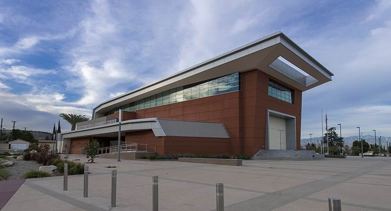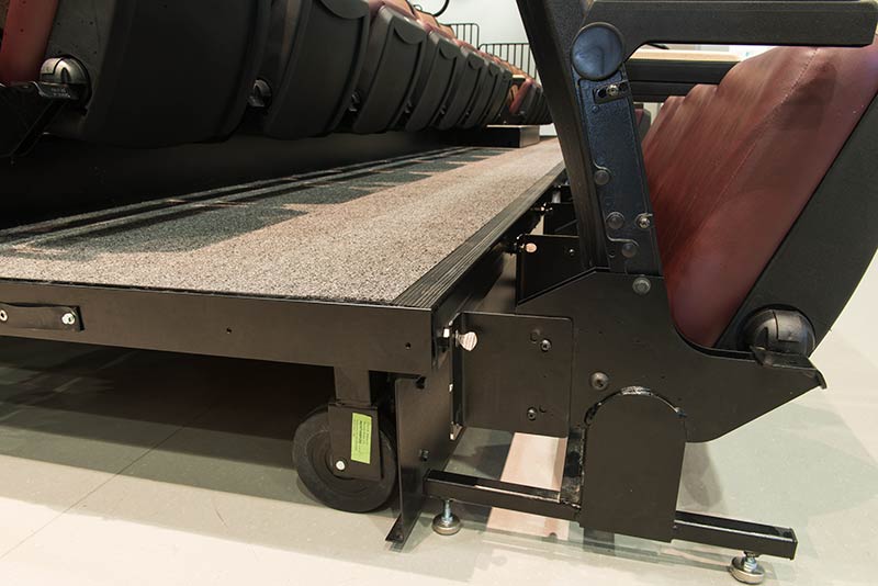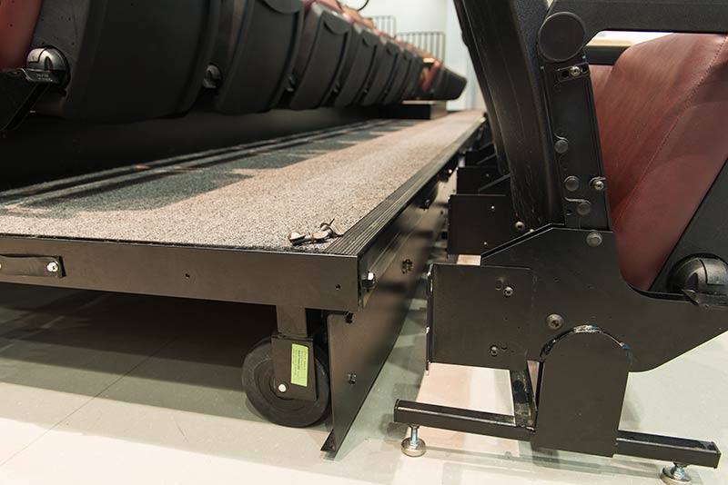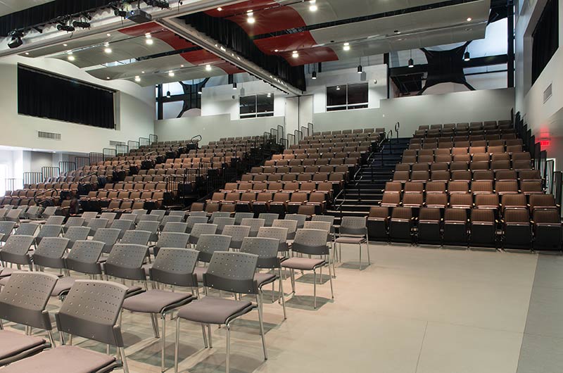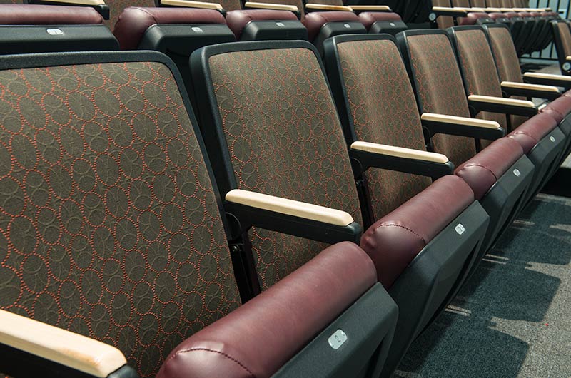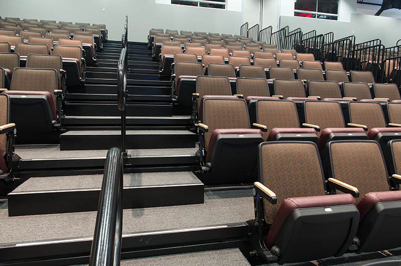 This unique facility was designed for California weather in mind, the stage can be used indoors or out! The indoor auditorium has a Prestige telescopic system designed with an 11" rise and 36" row spacing. Aisles are provided with extended spacing Smart Rails. The decking is carpeted in commercial-grade carpeting and the system is supplied with our IDS power system. In addition, this Prestige system includes first-row seating that is removable for wheelchair spaces. The fabric used is Maharam Chime for the seats and Maharam Plait for the backs.