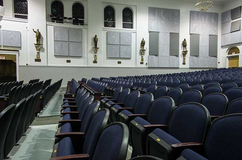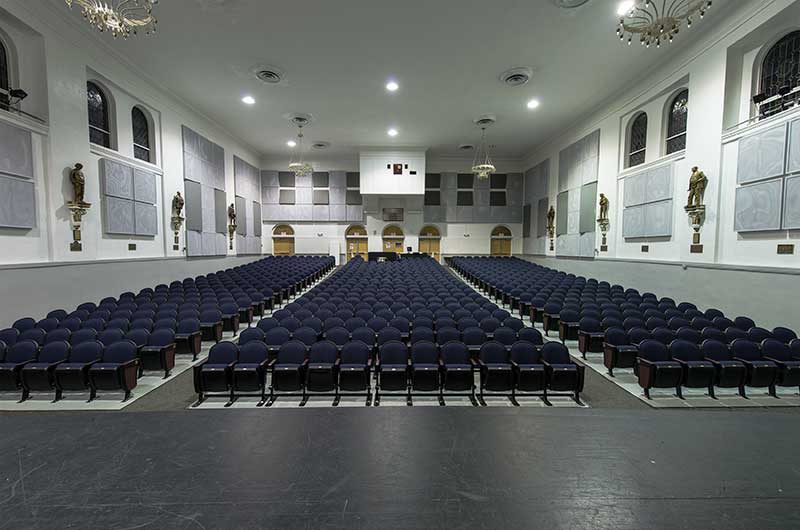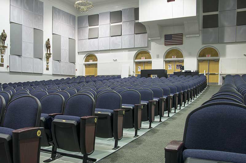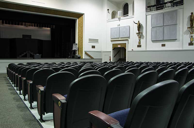 Henry B. Plant High School opened in 1926. A recent renovation to the auditorium included 642 model 91.12.10.4 Millennium chairs from Irwin Seating Company. The seating is upholstered with Absecon Mills Shire dark night fabric and finished with black plastic & powder coat, 18 red teak on red oak for the armrests and Gentry Oak laminate used for the aisle panels.
