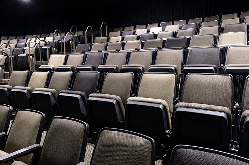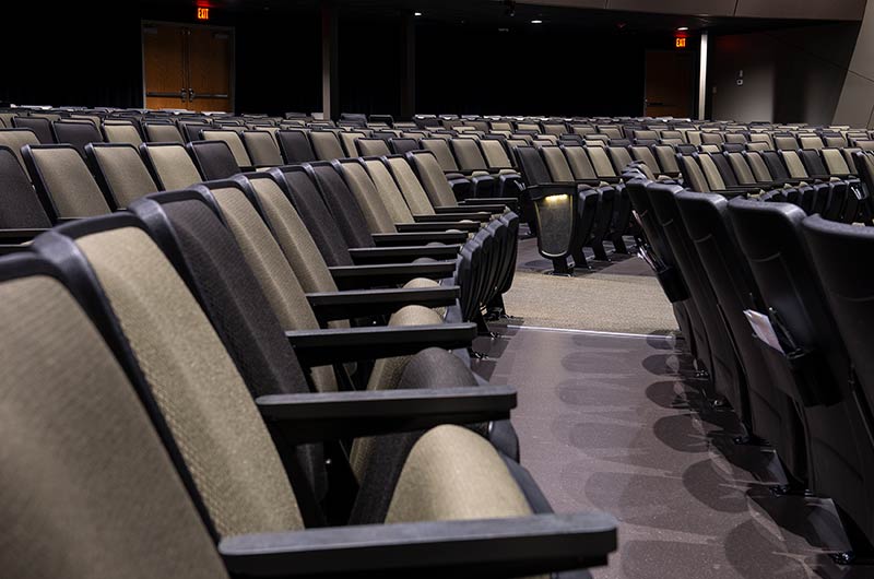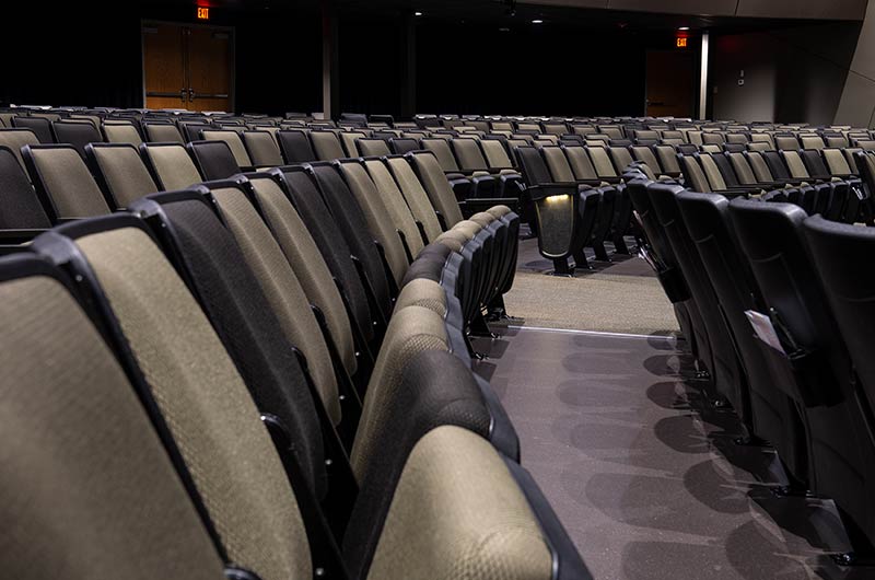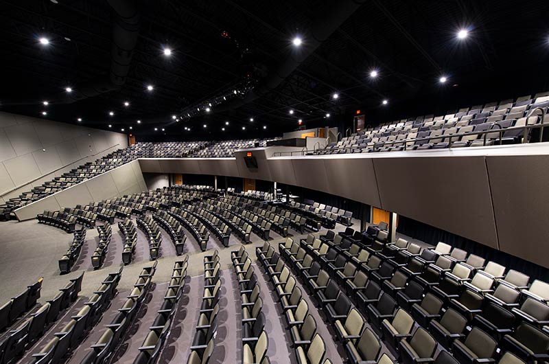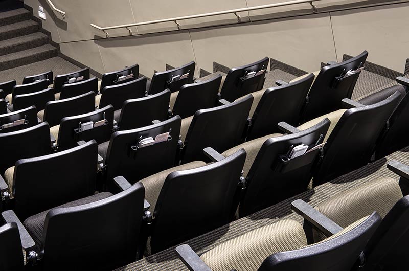 An expansion to the worship center in 2017 included 1,200 model 90.12.10.44 Citation chairs from Irwin Seating Company. These chairs feature flip-up center armrests, our No. 12 self-rising seat, and rear-mount envelope holders. The seating was supplied in three colors of Absecon Mills Icon fabric. Armrests and the aisle insert panel were surfaced with Nevamar Rush laminate.