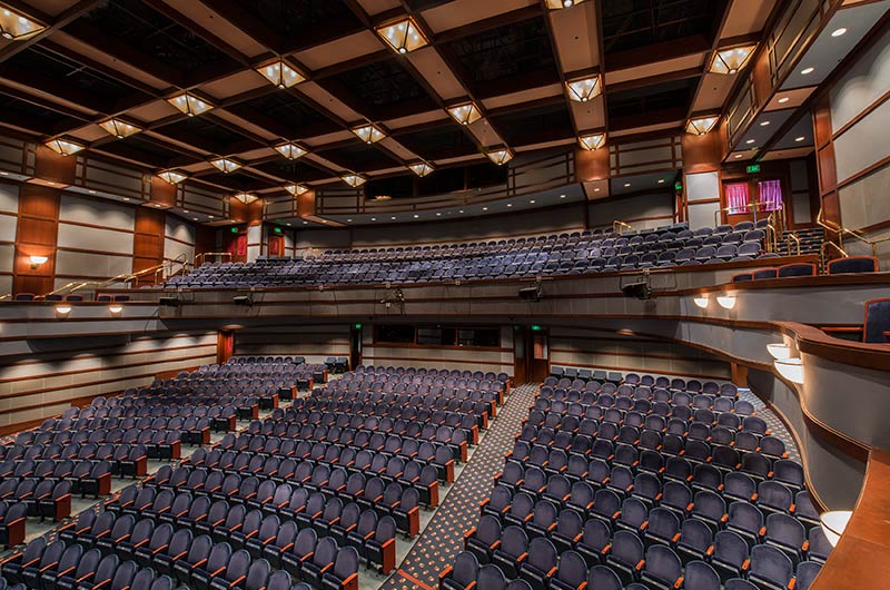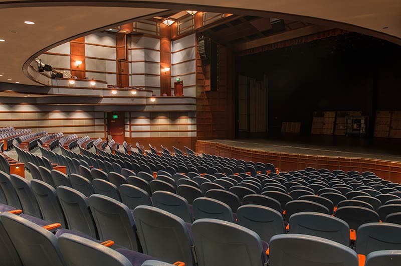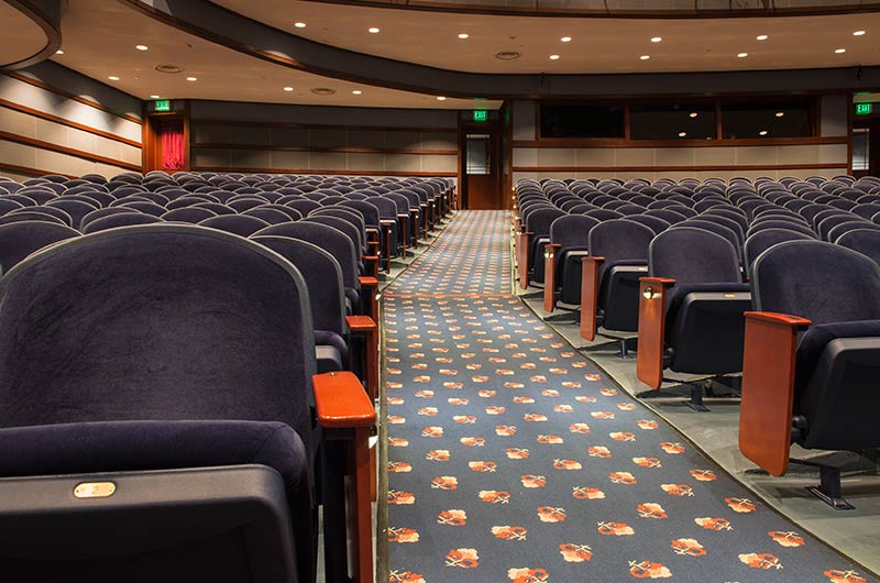 This comfortable venue in beautiful Walnut Creek, California has two theatres. One is an intimate 289 theatre the other pictured here seats 740. Both theatres are installed with Model 91.12.56.4 Millennium. The seating is upholstered in J.B. Martin Porto Lapis velour and wood components are stained with No. 29 Cherry, plastic and powder coat is Blue Dusk.