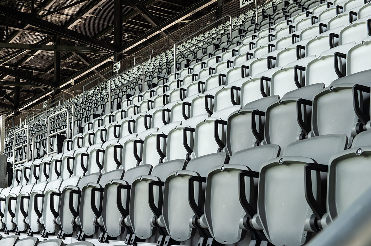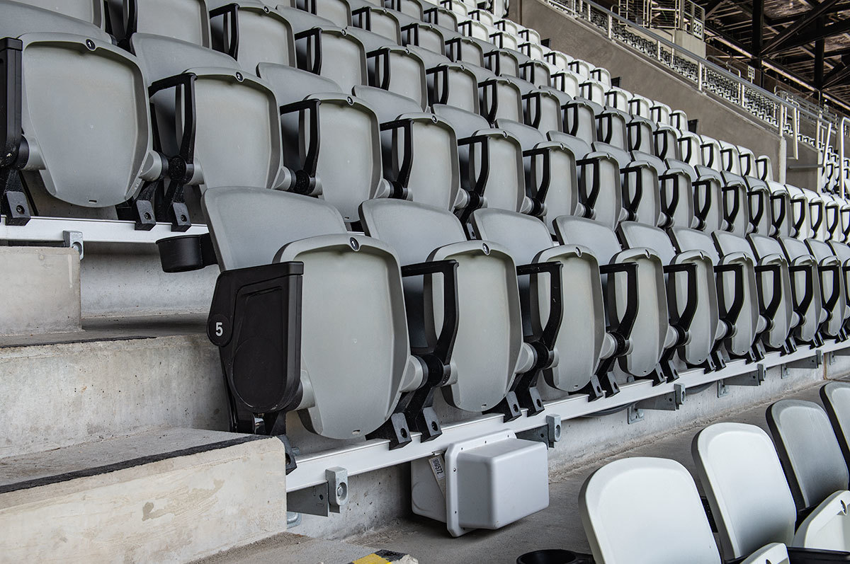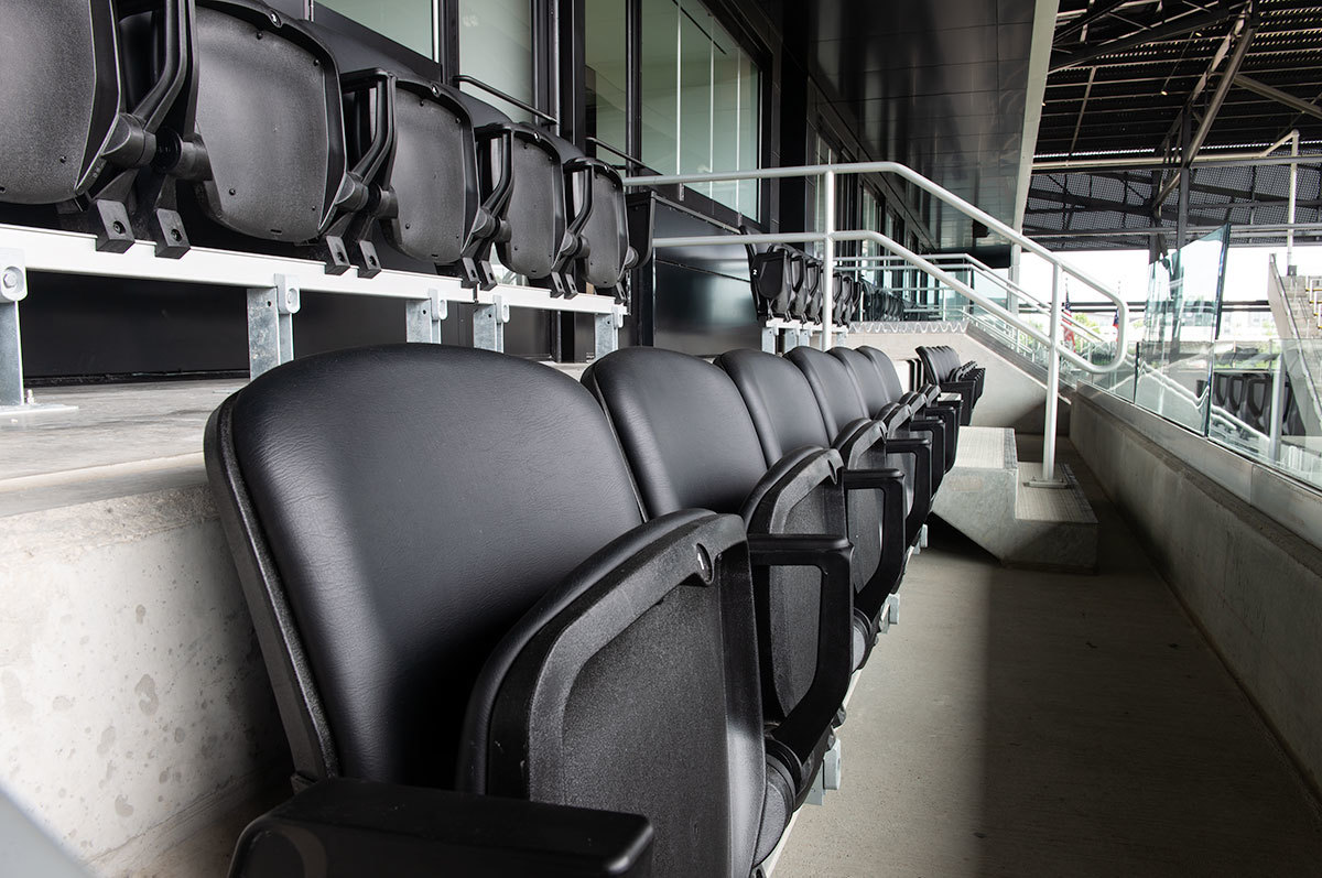 The majority of the seating are beam-mount Solara chairs with rear mounted cupholders. The seating was supplied in two shades of grey and installed in angular / geometric patterns. Club and suite areas are installed with wider, padded and upholstered Solaras or Irwin Seating's premium Signature chairs.