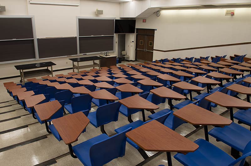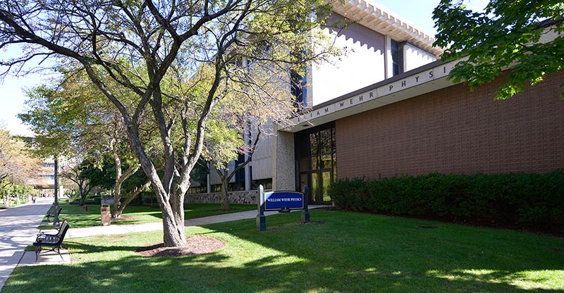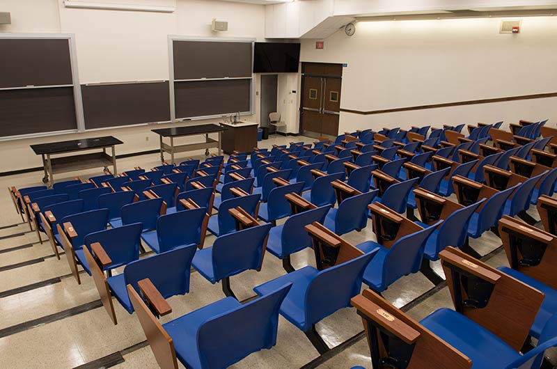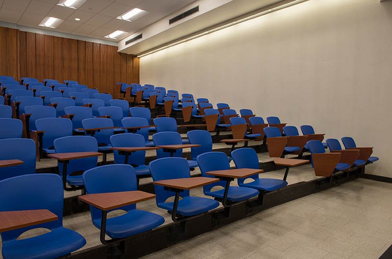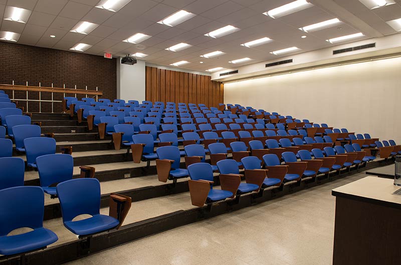 As the name implies the Wehr Physics Building houses Marquette's physics department. The building was constructed in 1973. Recent renovations to a number of lecture halls include the installation of new model no. 6.71 folding tablet armchairs. The seating was installed with riser mounted standards finished in black powder coat, cobalt blue seat shells and folding writing tablets surfaced in Nevamar Soveriegn Cherry.