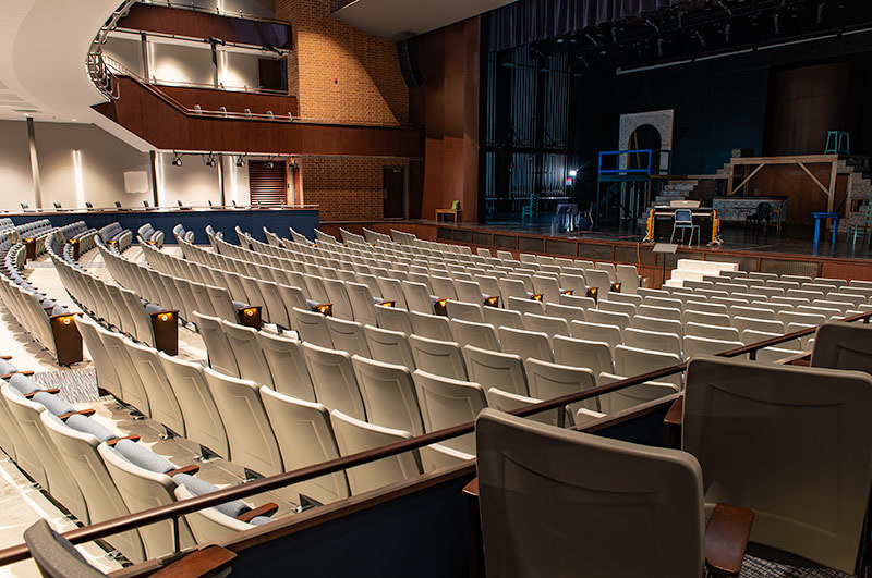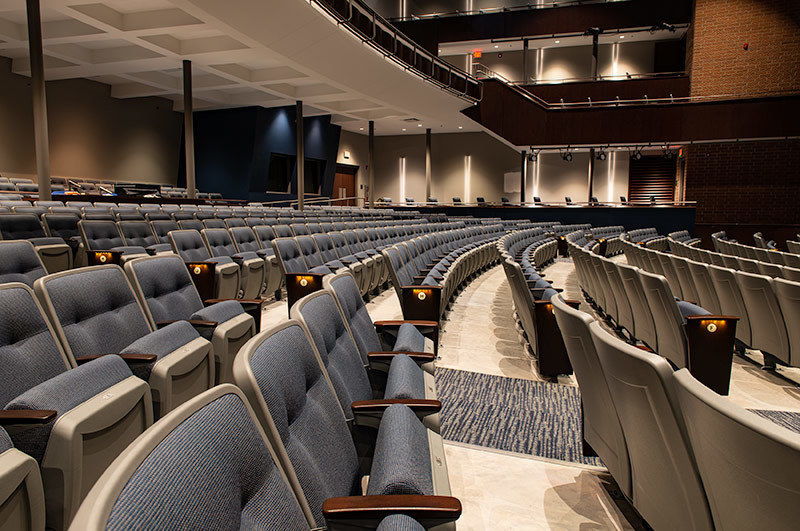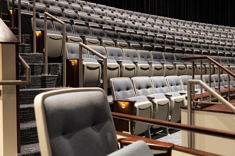 McFarland High School has a student population of approximately 700 students and works to create an atmosphere that "allow students and staff to build relationships that establish a family-friendly environment." The school has been undergoing a major renovation which includes a new 841 seat performing arts center. Installed with model 90.12.86.4 Citation that features tufted back upholstery, concealed LED aisle lights and comfort curved solid Maple armrests. The chairs are finished in Cadet Grey plastic and powder coat (paint) and No. 24 Classic Walnut with the back and seat upholstered with Absecon Mills, Shire, Tuscan Blue.
