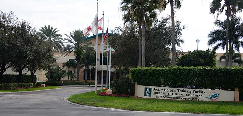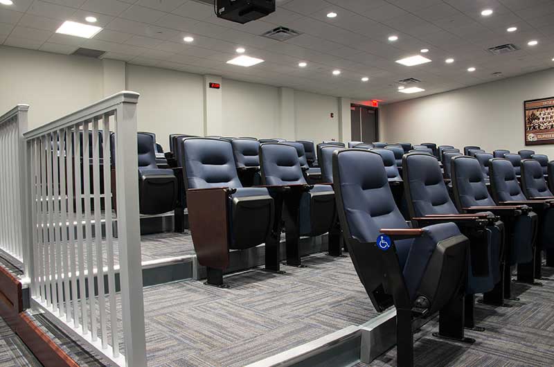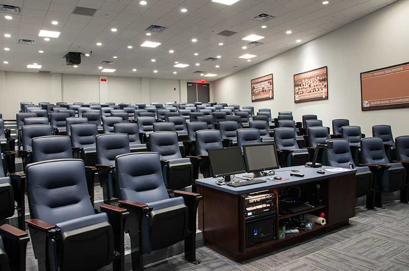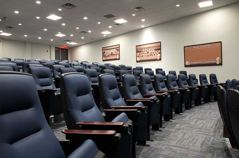 The training facility for the Miami Dolphins includes two film rooms with individually mounted 71.12.79.149 Signature chairs. This model was designed to accommodate larger athletes with chairs that are 3" higher than a standard chair, they are also wider and deeper than most chairs. The seating here is upholstered in CMI Illusion Marine vinyl, end panels and armrests are finished in No. 22 Classic Rosewood on Maple stain and the writing tablets are surfaced with Nevamar Dreamy Allusion laminate.