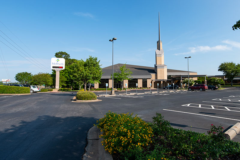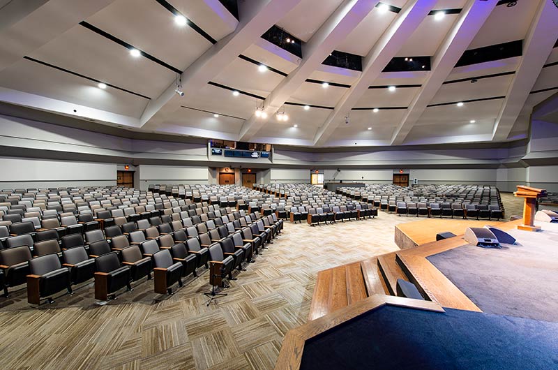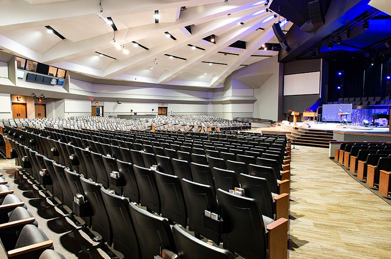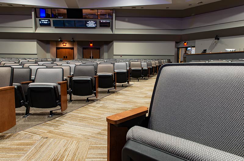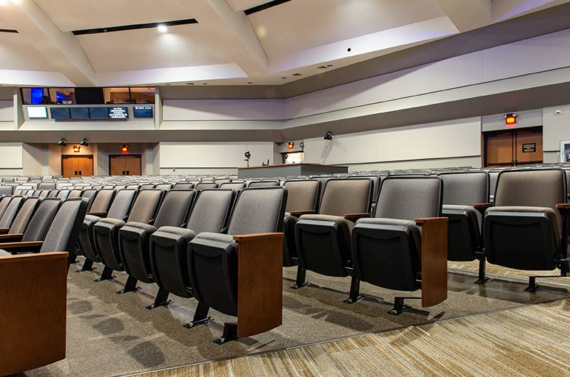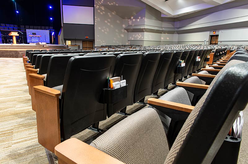 The beautiful campus of Mobberly Baptist Church includes a sanctuary with 1,186 models 90.12.17.4 & 90.12.17.44 Citation theater-style seating from Irwin Seating Company. These chairs are 100% manufactured in the United States with flip-up armrests and book boxes/envelope holders. The seating is finished with black plastic and powder coat (paint), No. 17 India Teak stain for the maple armrests and aisle panels and three colors of Absecon Mills Primary fabric.