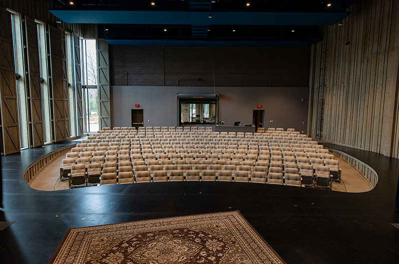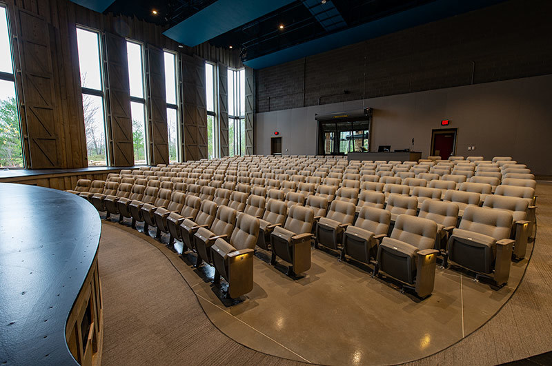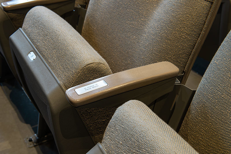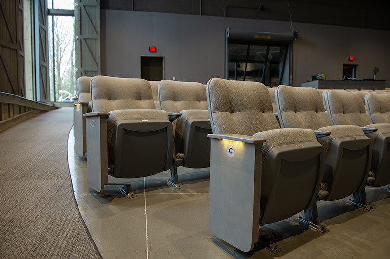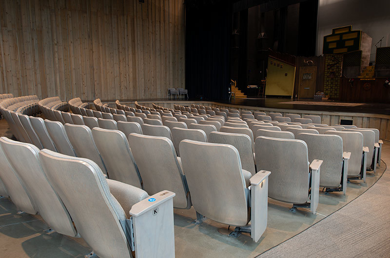 Northern Sky Theatre has operated an outdoor venue in beautiful Door County, Wisconsin since the early 70's. During that time the the troupe has written and performed a number of renowned musical comedies that highlight life in the Upper Midwest. With the desire to provide entertainment year round the Theatre opened the Creative Center in 2019. The Center includes gathering spaces, an art gallery and the 246 seat Barbara & Spencer Gould Theatre. Irwin Seating was privileged to provide model 52.12.56.4 Marquee chairs for this state of the art space. The seating features cantilevered aisle end panels, comfort curved hard wood arms, No. 12 seats with a loge cushion, concealed LED aisle lights and donor plates. The wood back Marquee chairs are finished in a custom wood stain on Maple, plastic and powder coat (paint) are Cadet Grey and the fabric is C.F. Stinson, Bali, Moonstone. The result is stunning!