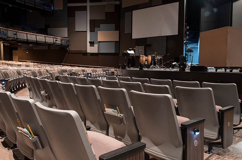 Northview Church's Carmel site is installed with 2,000 model 4.12.56.8 Citation chairs. The seating features cantilevered aisle end standards, LED aisle lights, under-seat book boxes and envelope holders. Backs and seats are upholstered with a COM fabric with the backs in two different fabrics from the seats. Aisle standards are surfaced with Nevamar Tendu laminate.