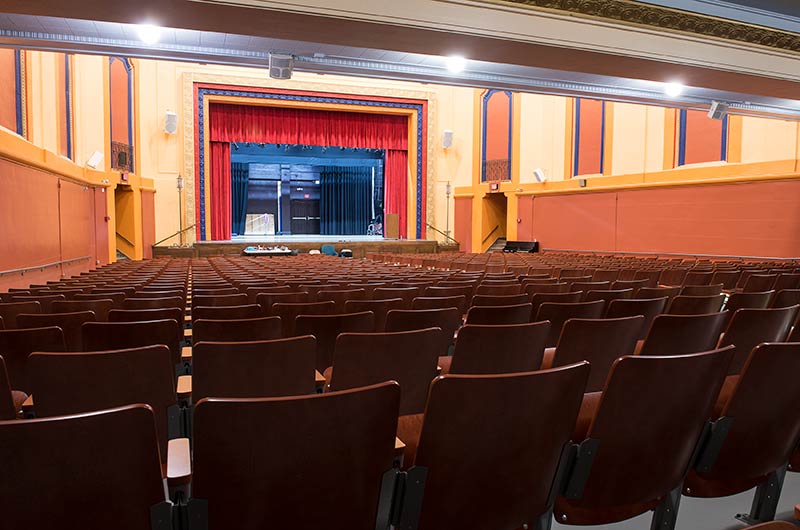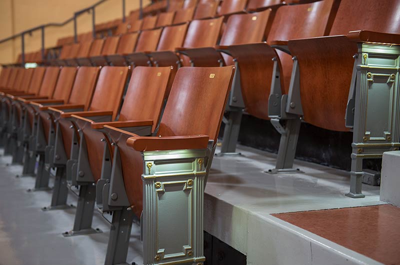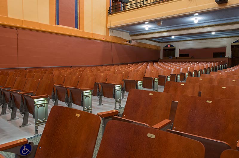 Ramsey Middle School is a 6 - 8 grade school in the Minneapolis Public School System. In 2015 the auditorium seating was replaced with model No. 1.14.163.4 Crusader theatre chairs. The cast aluminum aisle end standards and wood back and seats fit the decor of this grand old building beautifully. Steel components were powder coated in Cadet Grey and the Maple backs, seats and armrests were stained with our No. 29 cherry.