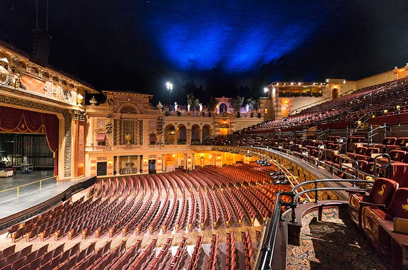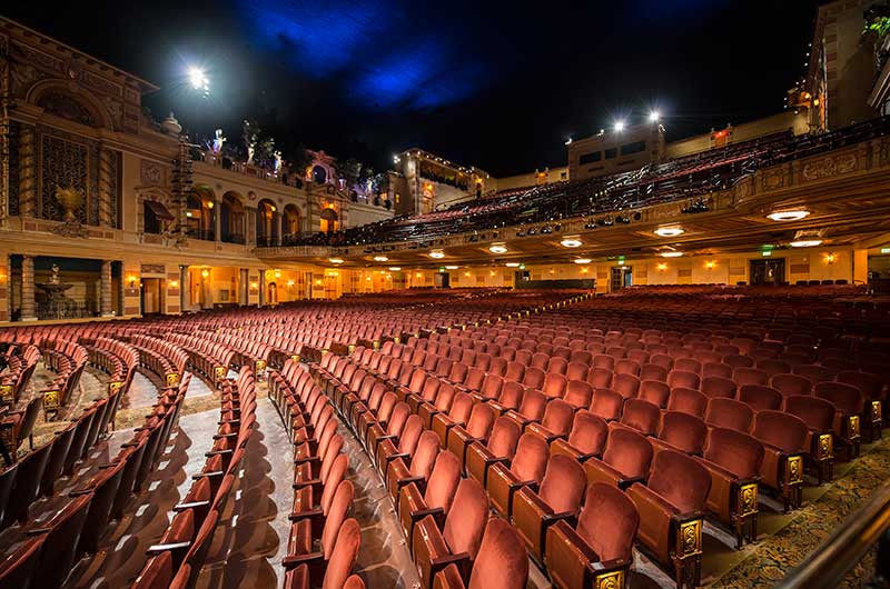 After millions of dollars and years of restoration work, the theatre reopened with its magnificent 15th-century Italian courtyard and gardens, arched surroundings, columns, decorative moldings and blue-domed ceiling.