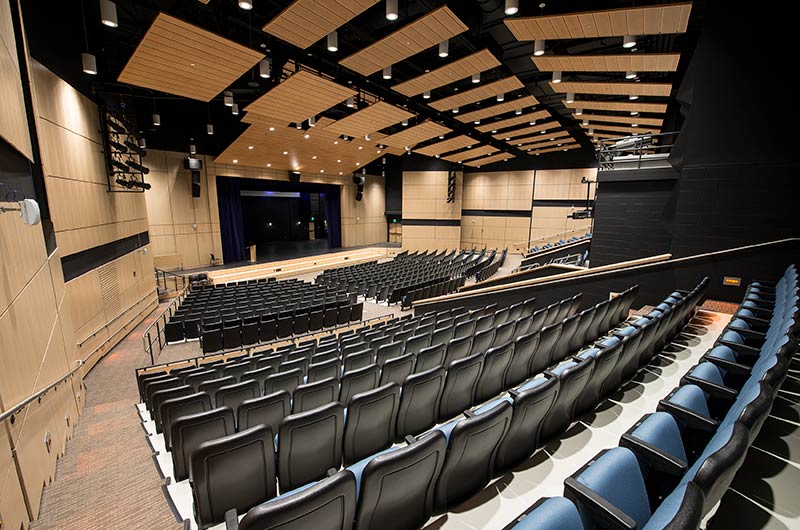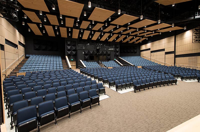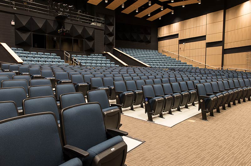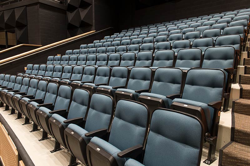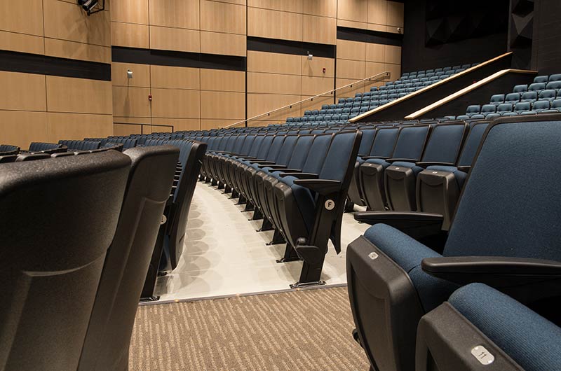 This attractive auditorium bridges the Scituate High and Middle Schools. In addition to that unique feature, two fixed seating models were supplied by Irwin Seating Company. The sloped floor area is installed with 90.12.00.4 Citation while the stepped riser area is installed with Marquee chairs. Both models are finished with black plastic and powder coat and they are upholstered in two different Maharam Messenger fabric colors.