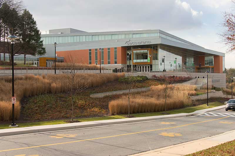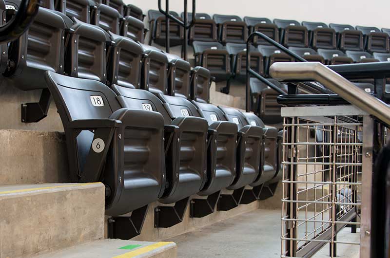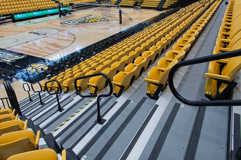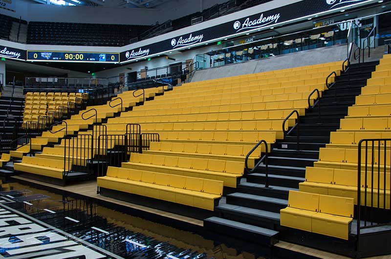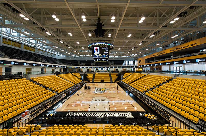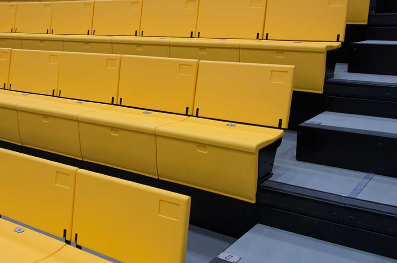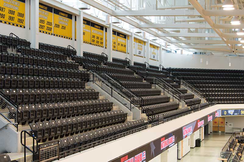 SECU Arena at Towson University is a 5,200-seat venue for athletics, sporting events, concerts, commencements and more. Four Tiger athletics teams compete in the new facility, including men’s and women’s basketball, volleyball and gymnastics. The arena opened in fall 2013 and was awarded LEED Gold certification for energy use, lighting, water and material use, in addition to a variety of other sustainable features. The upper bowl is installed with model 30.52.00.30 patriot, Club seating has 51.12.66.4 Marquee and the lower bowl sidelines has Prestige telescopic platforms with forward fold Patriot chairs. One baseline has model 4500 telescopic bleachers with blow mold seat modules and folding backrests.