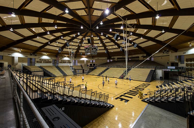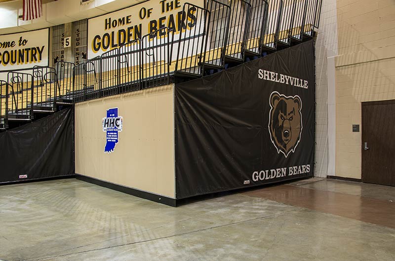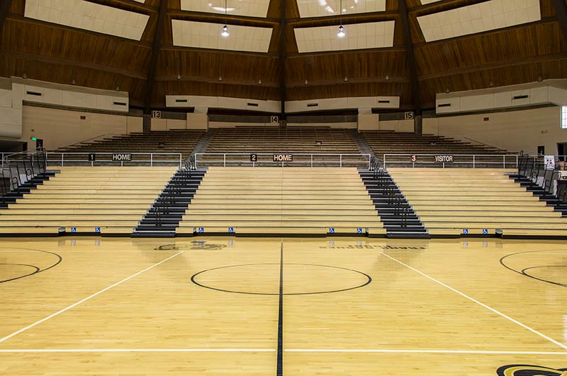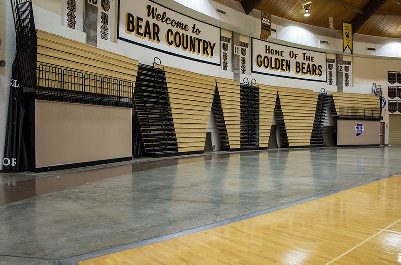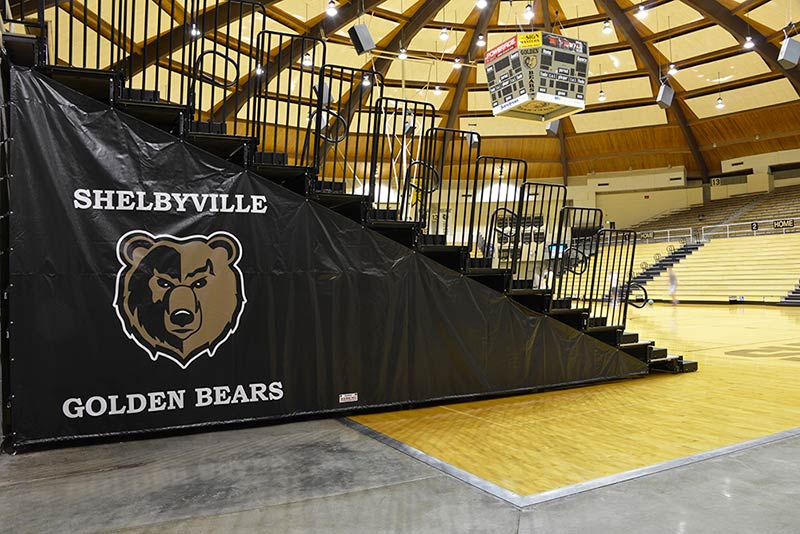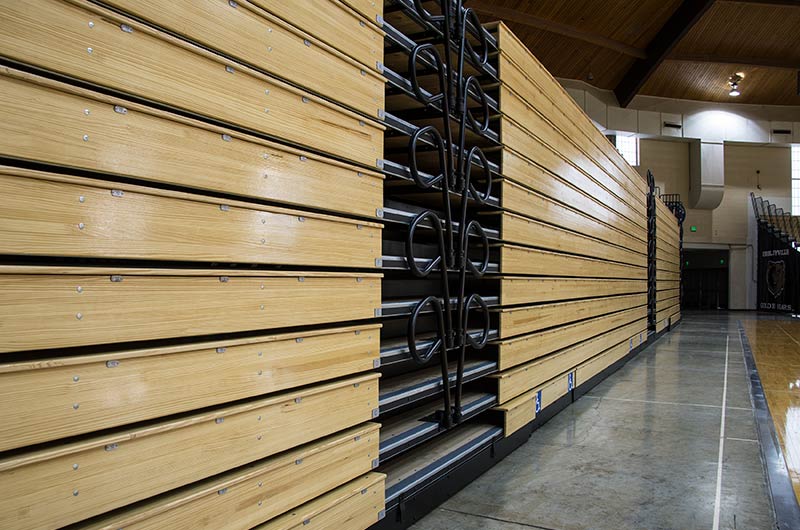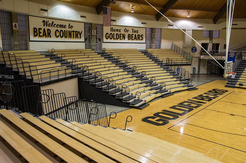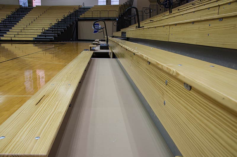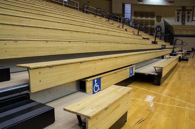 Model 4500 telescopic bleachers with wood bench seating, smart rails, panelled, screen printed vinyl end curtains, self-storing end rails and ADA recoverable wheelchair spaces. End court bleachers are provided in tapered sections. The units are provided with 208/230 VAC IDS power supply with steerable control.