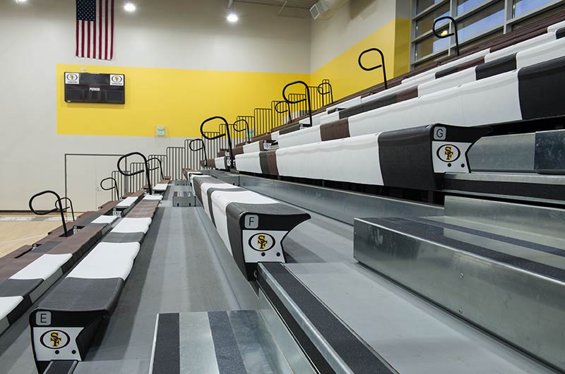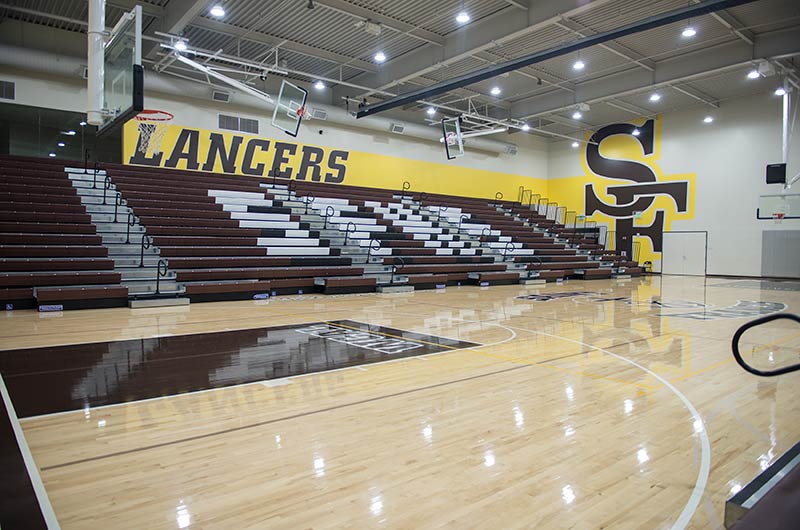 St. Francis High School has an enrollment of around 1,700 students and is committed to helping students in their spiritual, intellectual, and social development. A recent expansion of the athletic facilities included the addition of a new competition gym and the renovation of the existing one with Irwin Seating installing model 4500 telescopic bleachers in both. Both are provided with Infinity Seat Modules with screen printed logo ends, smart rails and our IDS power system. The main competition gym also includes a coordinated color graphics package with screen printed logo on the end curtains and the school's initials laid out in two additional seat module colors.