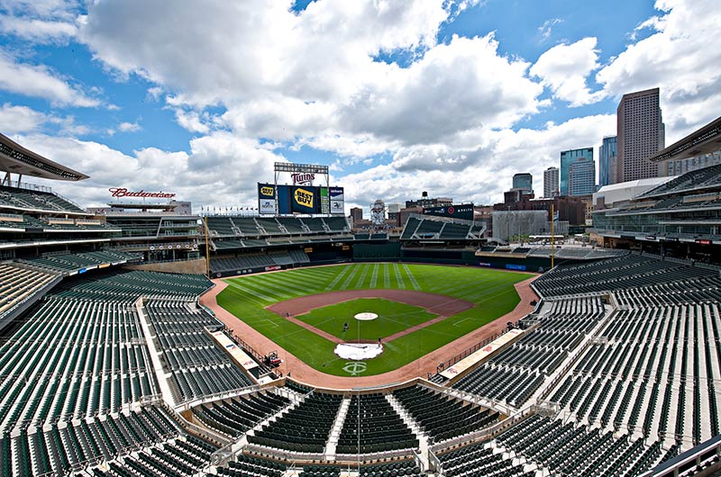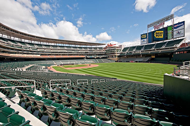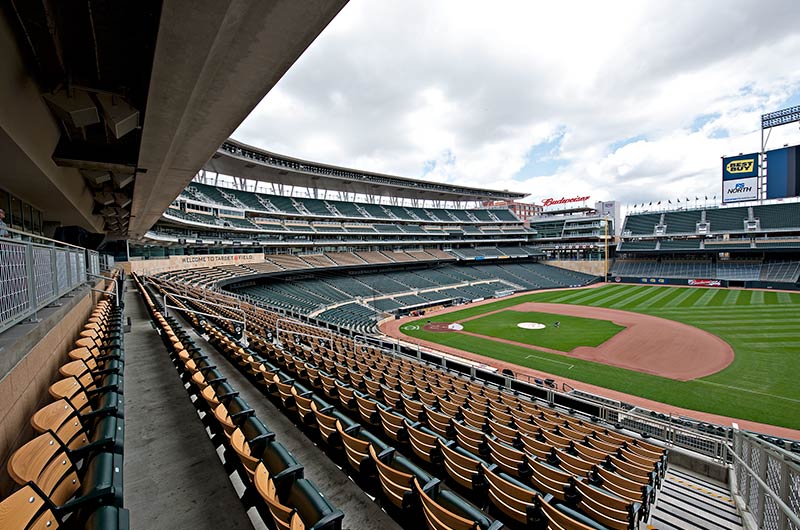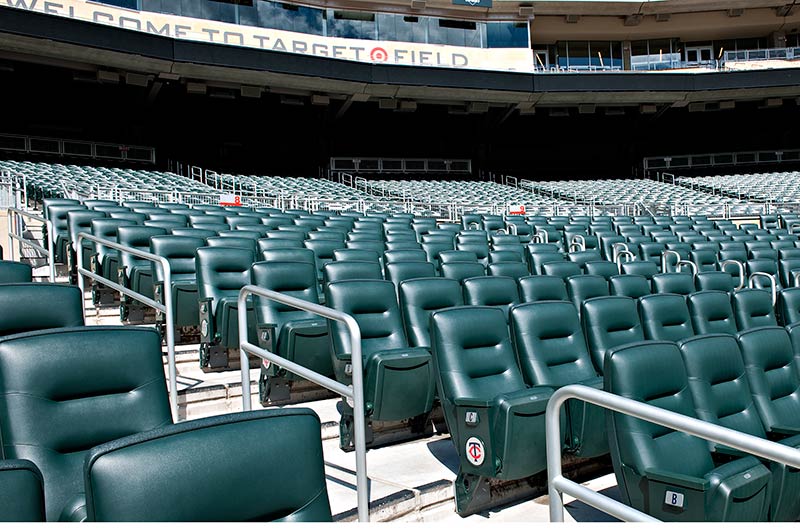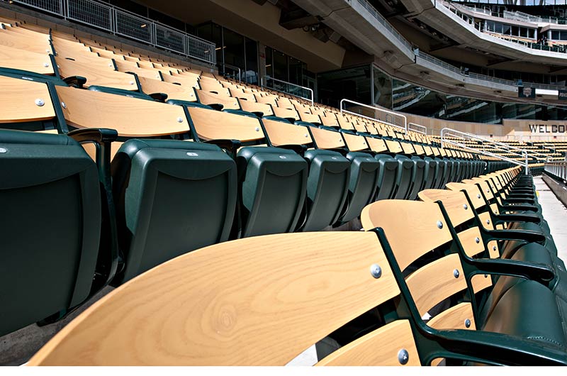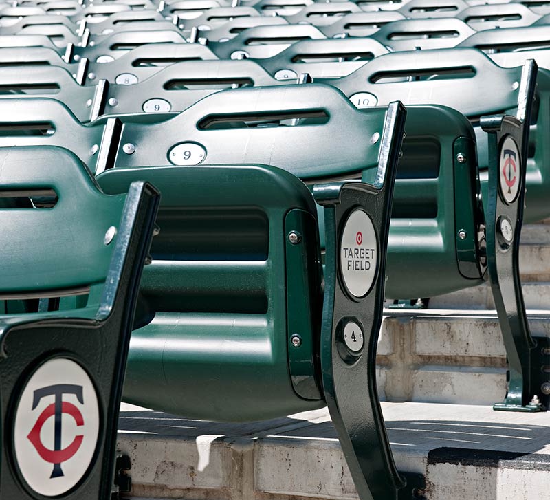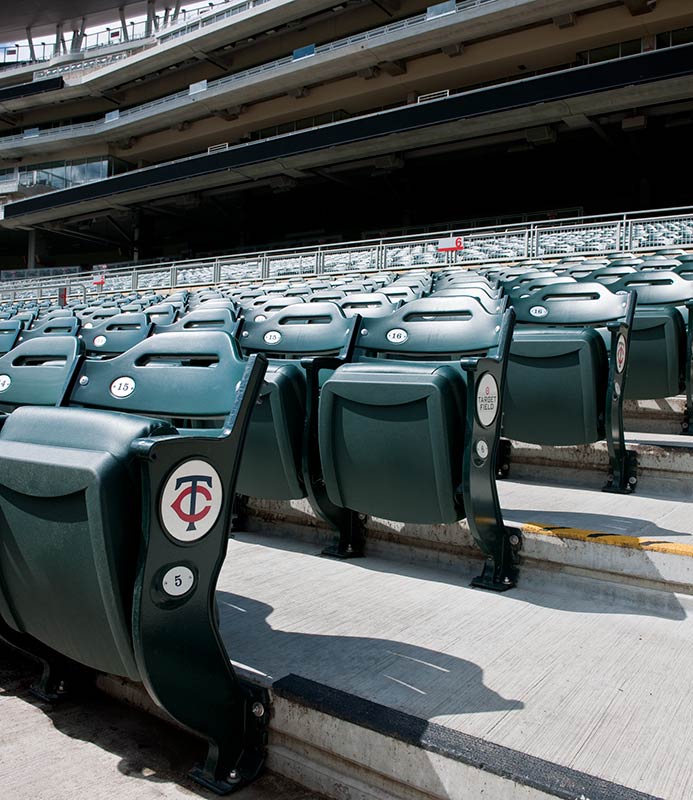 Target Field, home of the Minnesota Twins is installed with multiple models from Irwin Seating Company. Chairs provided include models 39.45.35.35 Senator, 39.12.35.35 Senator, 71.12.18.12 Signature, 239.12.35.35 Senator, a faux wood slat back chair.