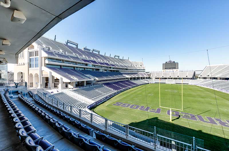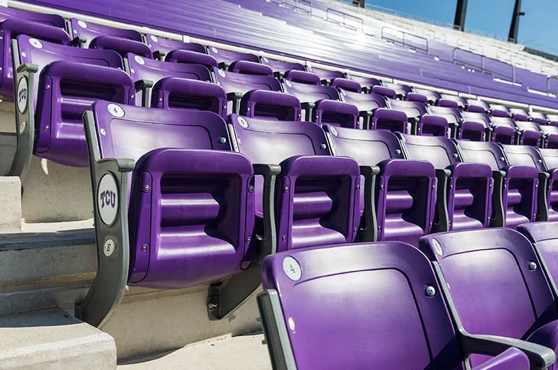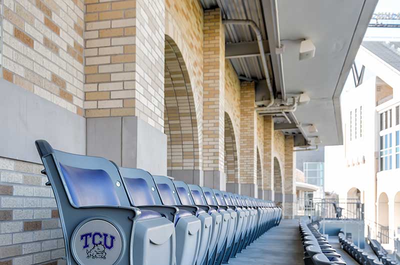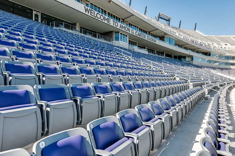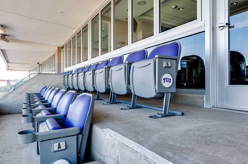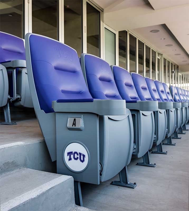 A two-year renovation and expansion project at Texas Christian University's Amon Carter Stadium finished up in 2012. The project includes chairback stadium seating in club and suite areas. Included in the project is model 130.45.35.35 Centurion, 131.12.35.35 Centurion with the No. 12 seat, 47.12.18.12 Millennium and 71.12.18.12 Signature chairs. Aisle end panels are provided with screen printed logo plates.
