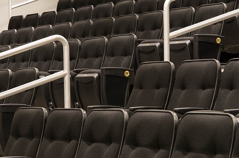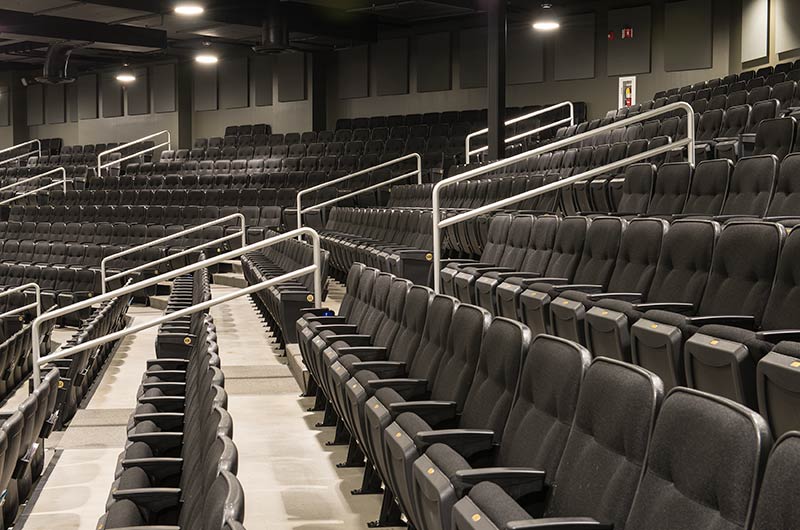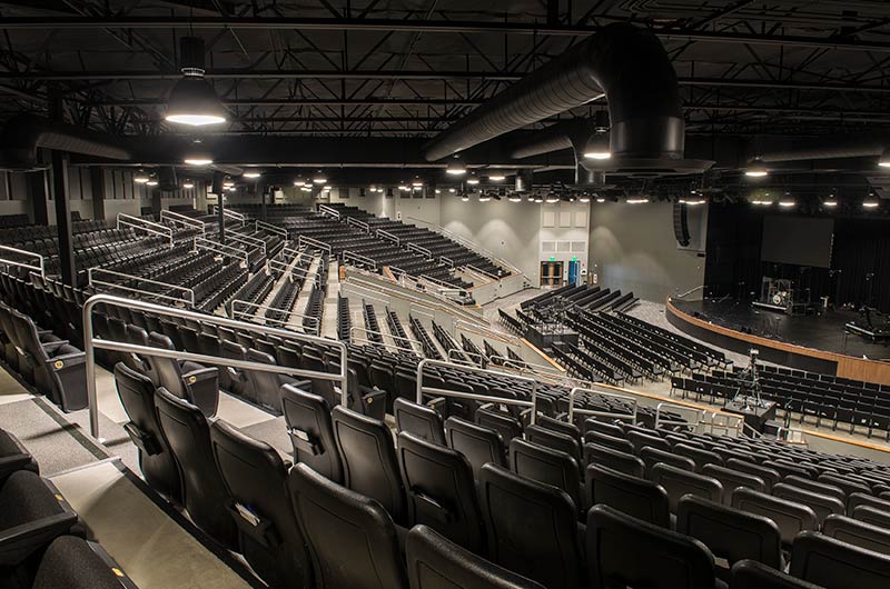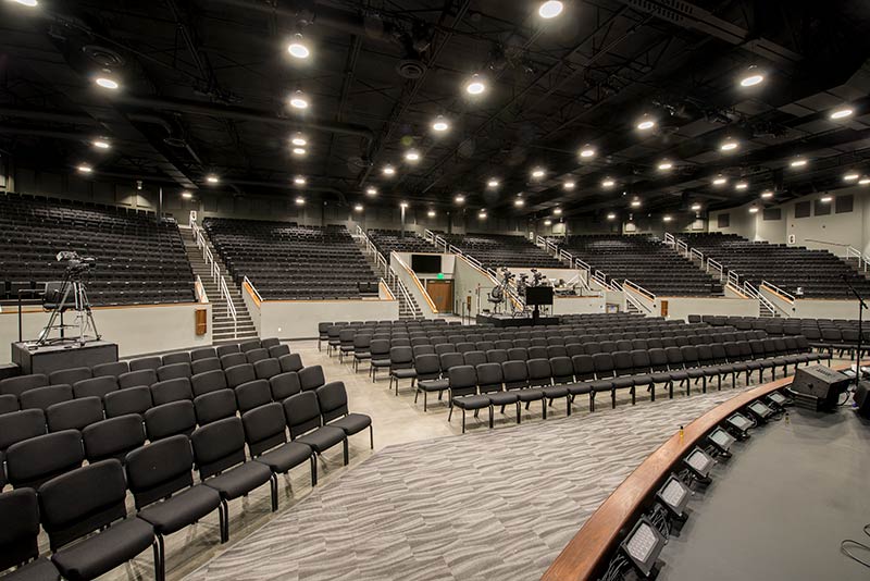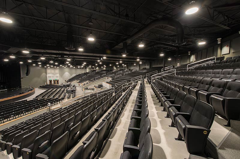 A beautiful campus in a beautiful location, The Father's House fixed seating is model 51.12.10.4 Marquee. These chairs are upholstered in Absecon Mills Sherpa black fabric. The seating is provided with comfort curved polymer armrests and Caddy envelope holders.