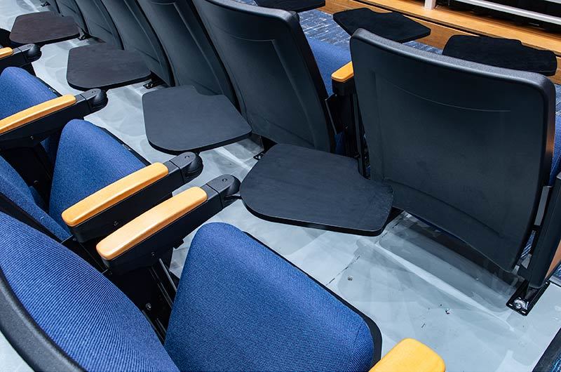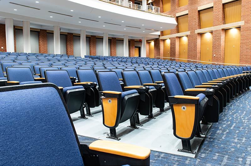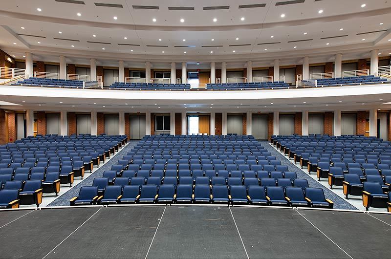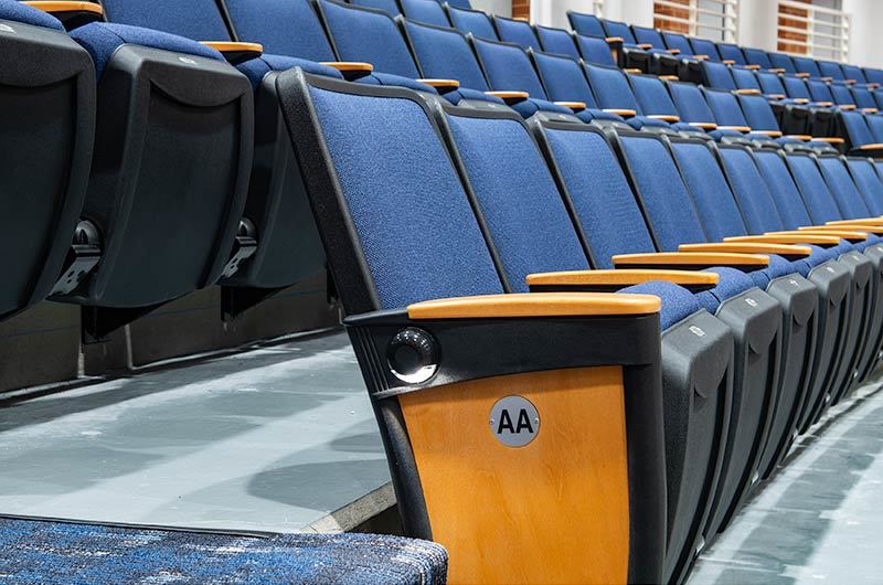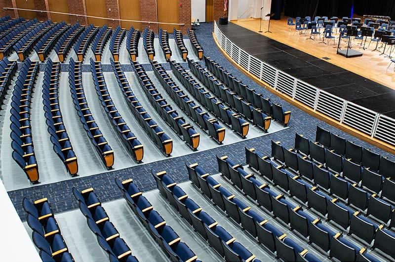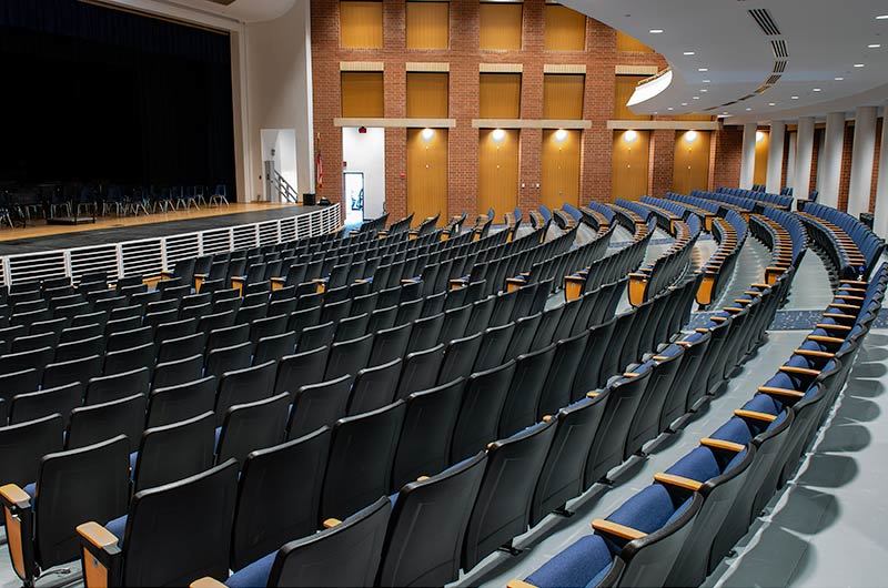 During Summer break of 2018 Tift County High School's performing arts center was re-seated with 800 new Citation chairs from Irwin Seating Company. The seating was provided with No. 12 seats, the No. 10 aisle standard with a veneer insert panel and Focal LED aisle lights. Also furnished were comfort curved solid hardwood arms, 120 square inch writing tablets, seat number/row letter plates and movable bases that provide wheelchair spaces when needed. Plastic and steel were supplied in black, Maple wood components were finished in No. 27 classic golden and the chairs were upholstered with Absecon Mills, Shire, Delft Blue fabric.
