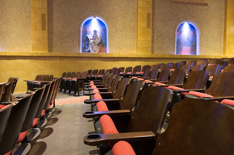 To accentuate the historic nature of the theatre, a custom, non-upholstered Crusader back was constructed and installed along with cast aisle standards. To assist with creature comforts, our No. 12 seat was used, as were wood armrests with cupholder inserts.