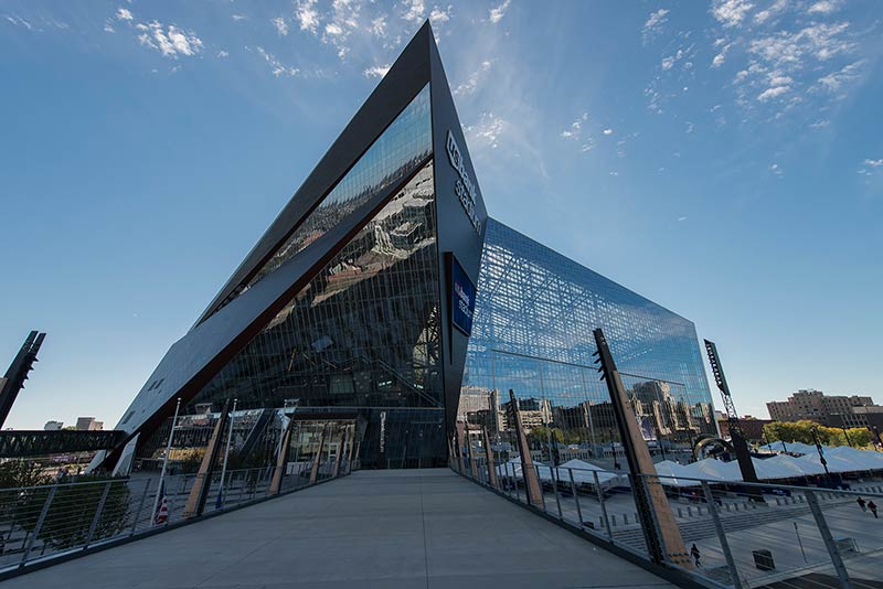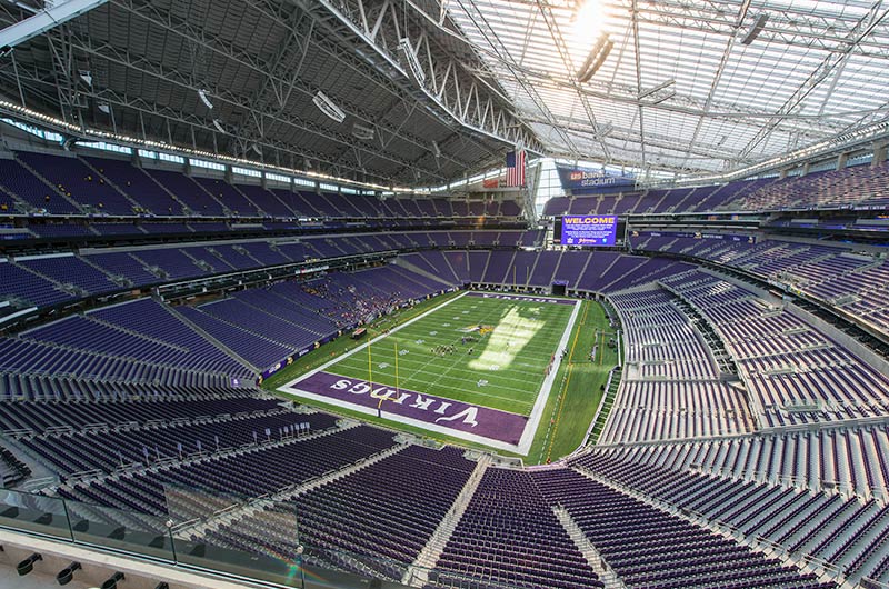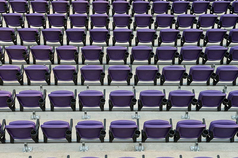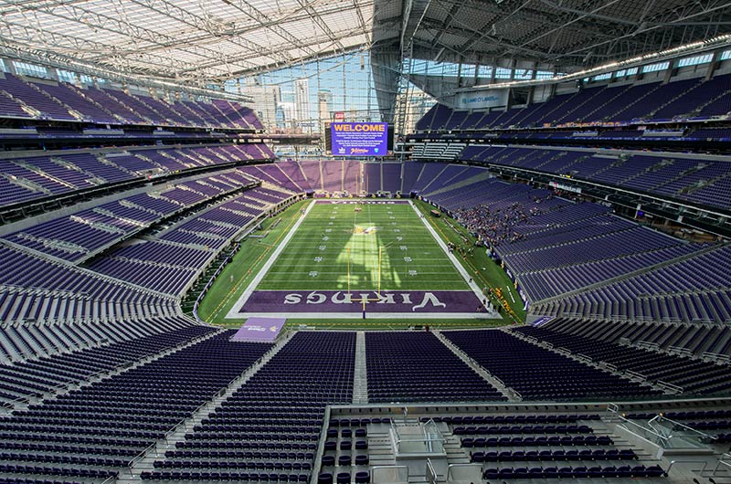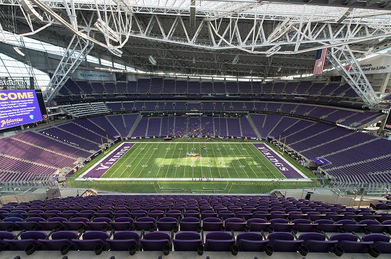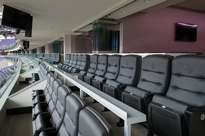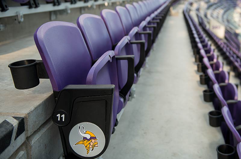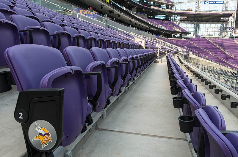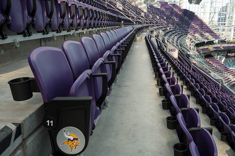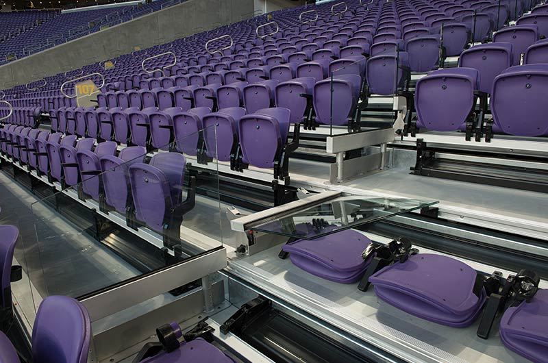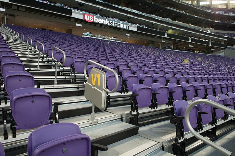U.S. Bank Stadium has a capacity of more than 66,000. The stadium features the largest transparent roof in the United States, the largest set of pivoting glass doors in the World and one of the largest telescopic seating systems ever manufactured! Seating areas are differentiated from one another with four separate models from Irwin Seating Company. The Suites are installed with model 72.12.90.4 Signature, the General and Club areas are outfitted with beam-mount Solara chairs while the Club sections feature padded and upholstered versions. The custom telescopic unit was engineered and built to provide patrons with a deck that feels as solid as the chairs installed on concrete. The system also features some operational advantages that include semi-automatic chair operation, folding glass partitions that divide club areas, quick-release front rails/aisle handrails and a unique in-floor alignment system that ensures proper tracking while opening or closing the unit. The last two rows of the system are provided with a hinged deck that allows the massive 35-row system to store completely beneath the concrete.