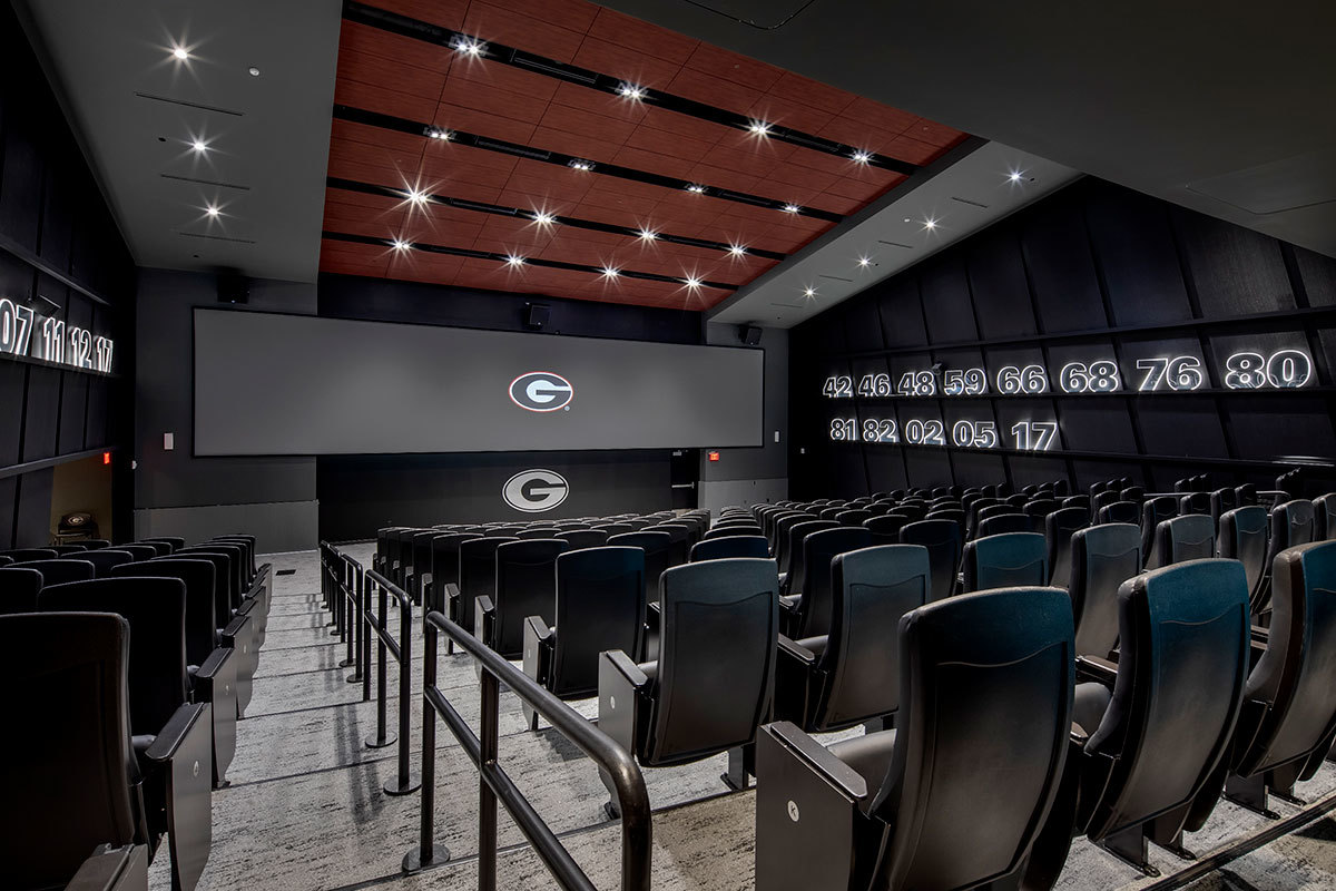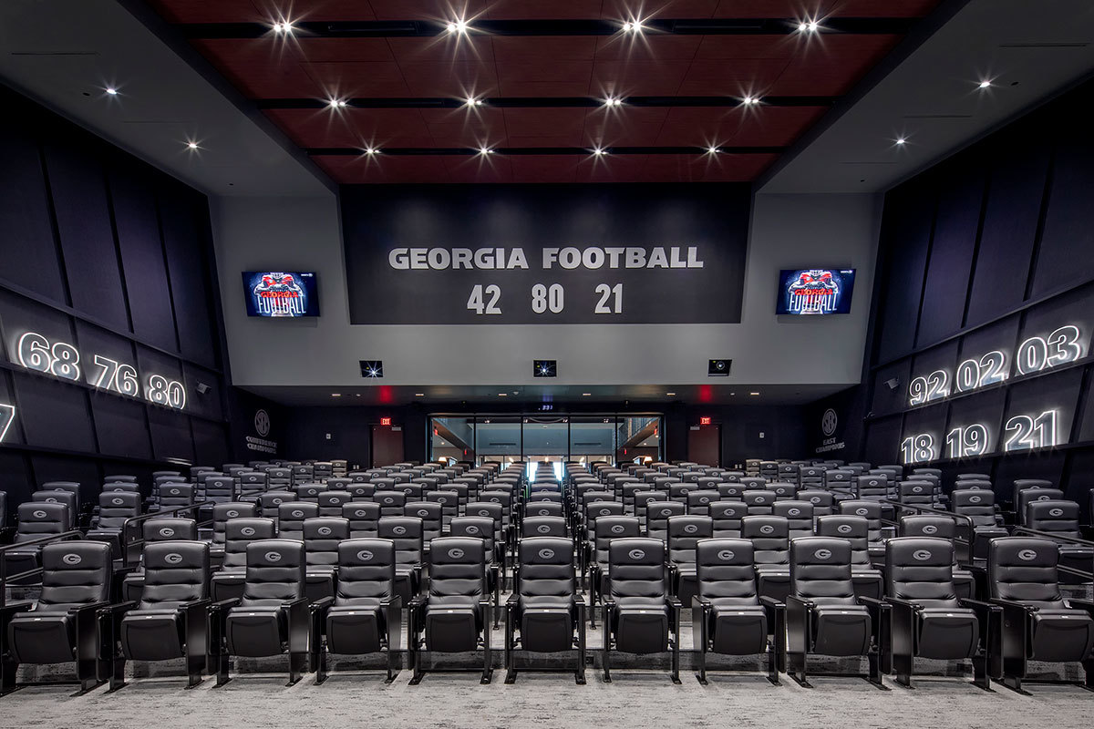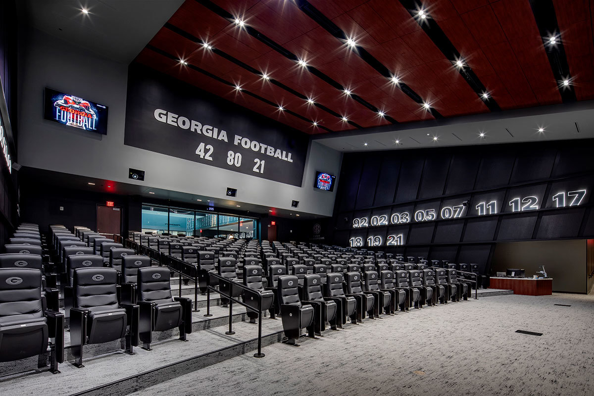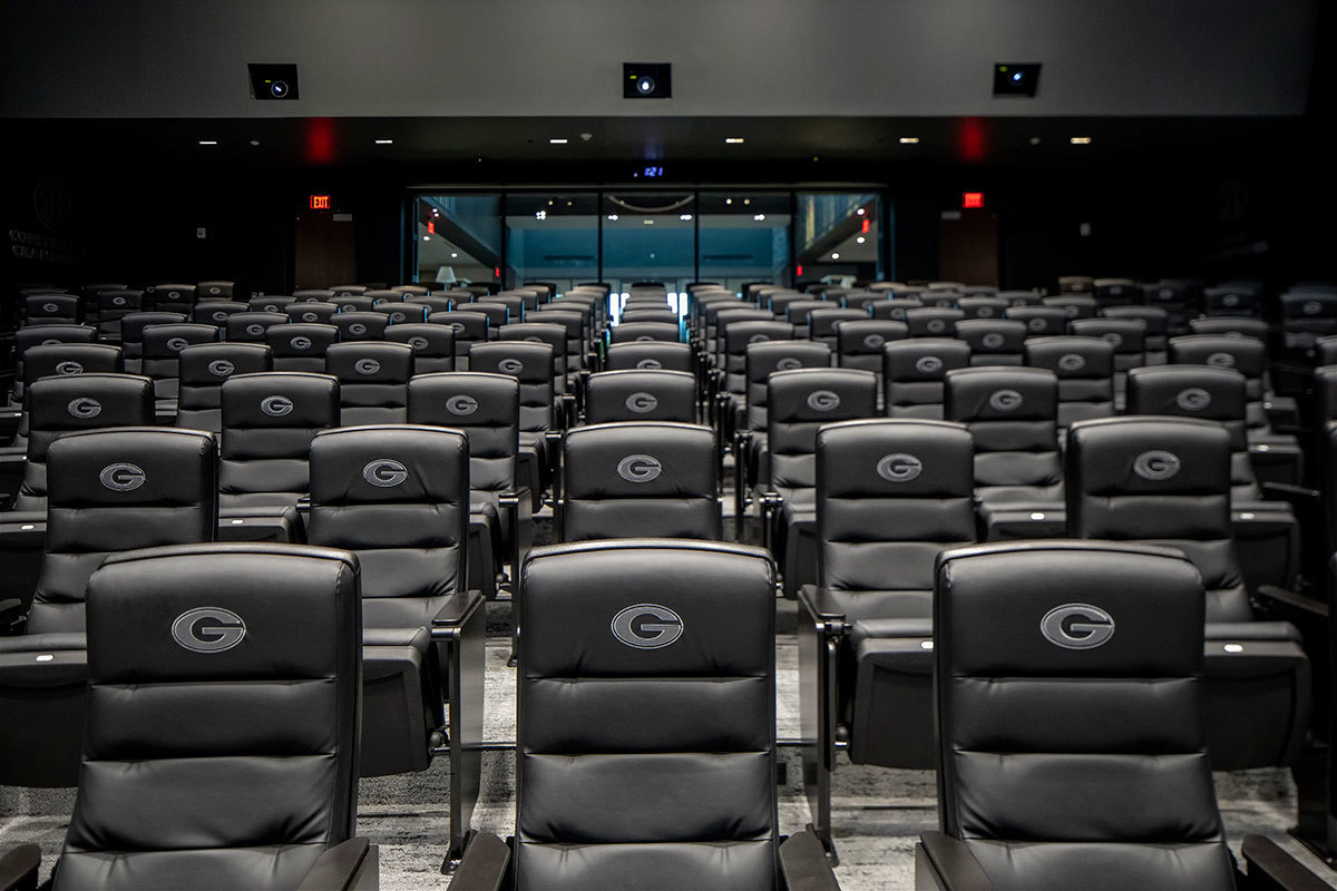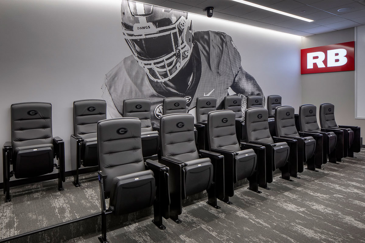 Those meeting rooms are installed with Film Room Signature chairs from Irwin Seating. These chairs are designed for athletes who require more room and height than most of us need. Backs and seats are upholstered with Illusion Vinyl and include the Georgia logo embroidered on the backs.