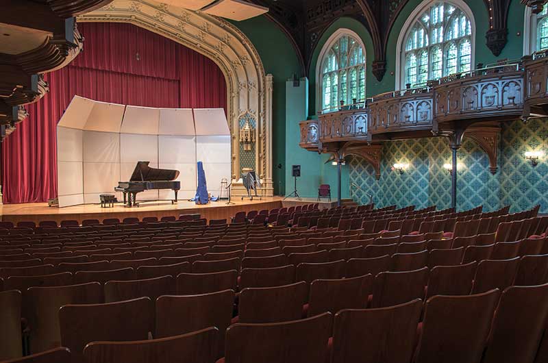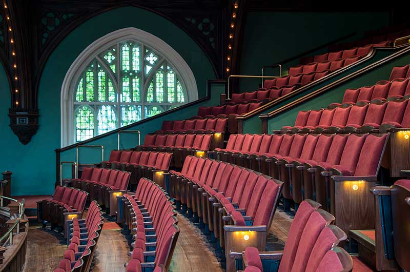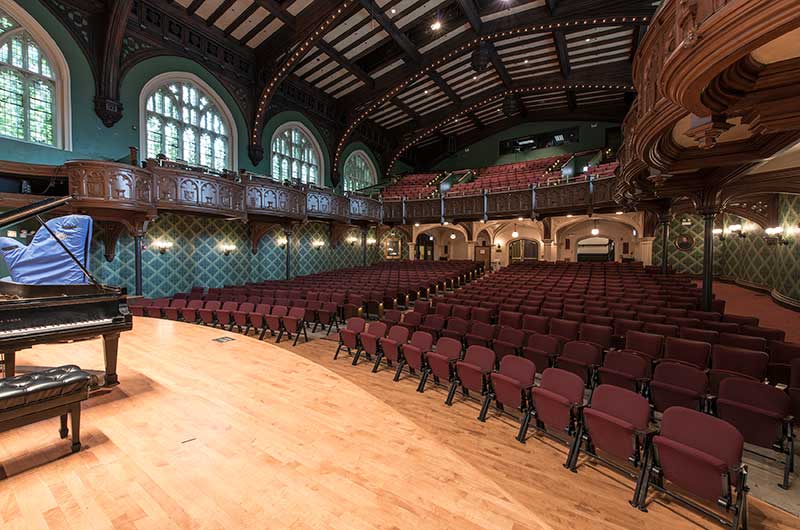 Mandel Hall’s rich Victorian interior includes seating for 878 audience members, an ornate balcony, majestic windows (including one made by Tiffany & Co. given to the University by the class of 1902), and detailed oak woodwork. Mandel Hall recently underwent a major renovation that finished in January 2013, which focused on improving the interior of the theatre and included new seating from Irwin Seating Company.