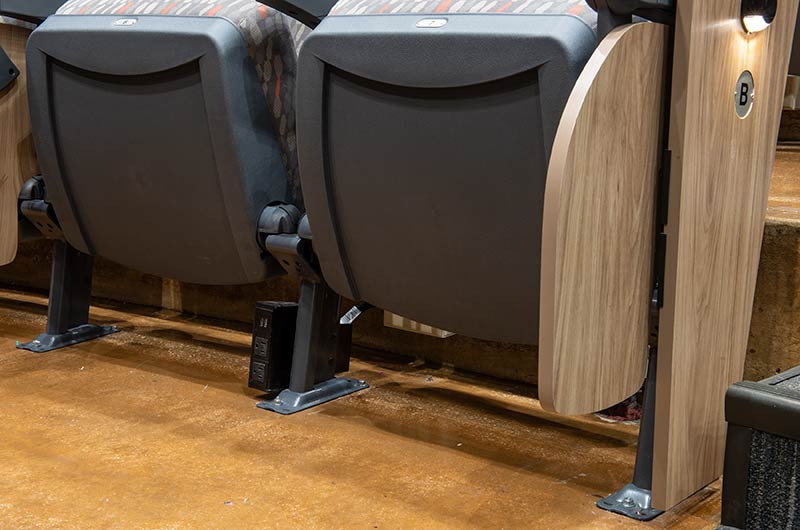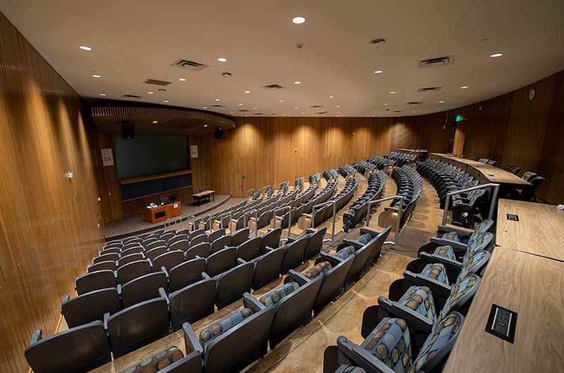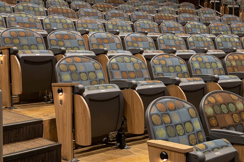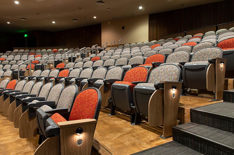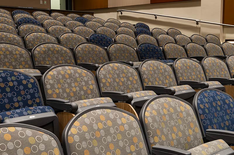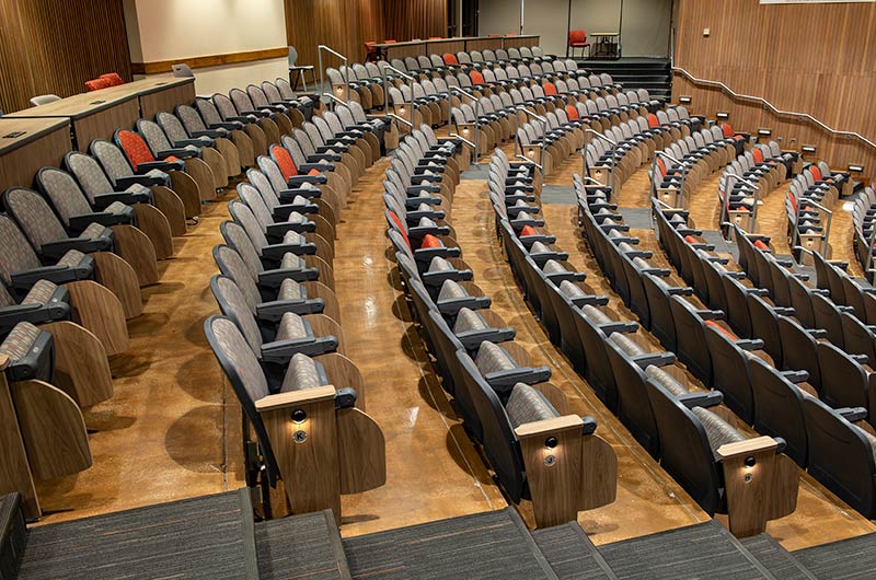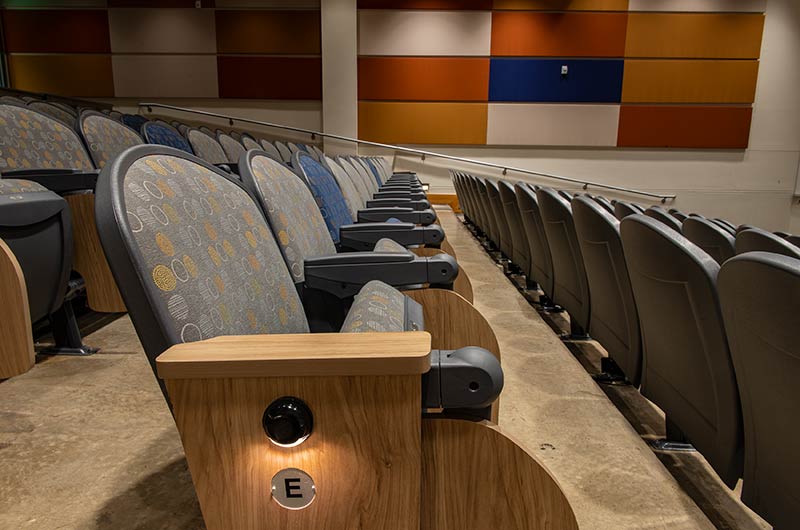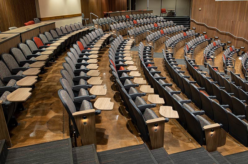 Over the last few years, Irwin Seating Company has supplied seating for a number of rooms at the University of Texas-San Antonio. Chair model selected by the University is 91.12.86.4 Millennium with 151 sq. in. writing tablets, Focal LED aisle lights and 120V / USB charging stations. Color selections include Charcoal Grey plastic and powder coat (paint), Nevamar Dry Creek Plum Tree laminate for aisle end panels/arms and writing tablets. The Flawn Hall rooms are upholstered with Maharam Slant Quarry & Fiery fabrics, chairs in the Engineering Hall room are upholstered with Maharam Amuse Alloy and Admiral and the McKinney Hall seating was upholstered with Momentum Catalogue Tidal and Bark fabrics.