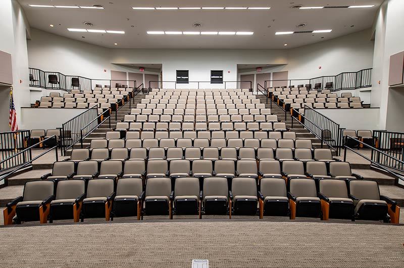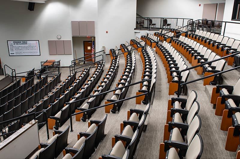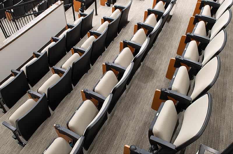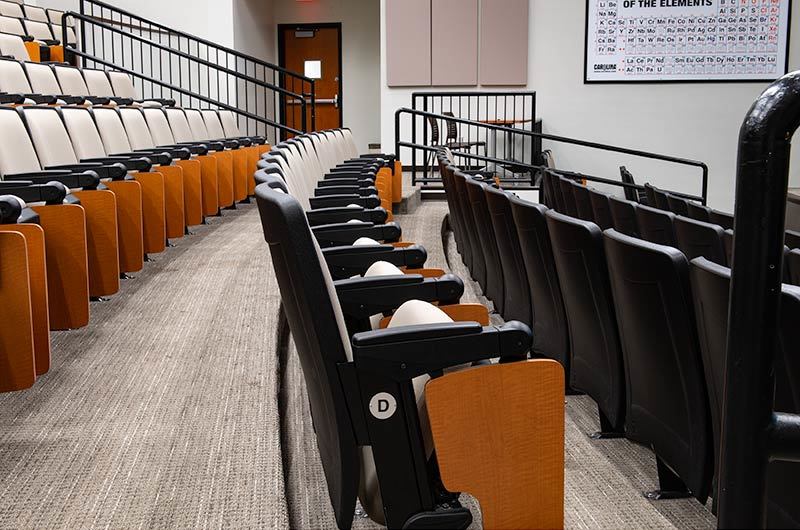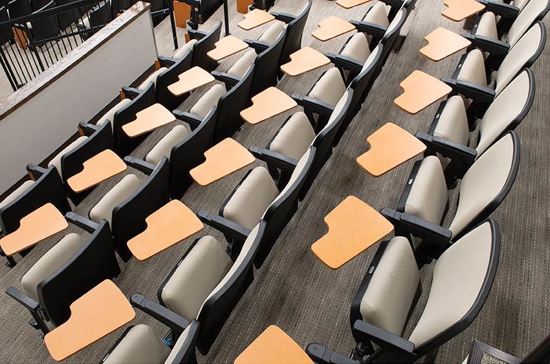 Bailey Science Center includes two large lecture halls with model 90.12.00.4 Citation chairs. These chairs are provided with a custom shaped, 138-square inch writing tablet surfaced with Nevamar Caramel Sagawood. These Citation chairs were also supplied with row letter and seat number plates (clear aluminum) and comfort curved polymer armrests. The upholstery fabric selected for this project is Momentum, Odyssey, Linen.