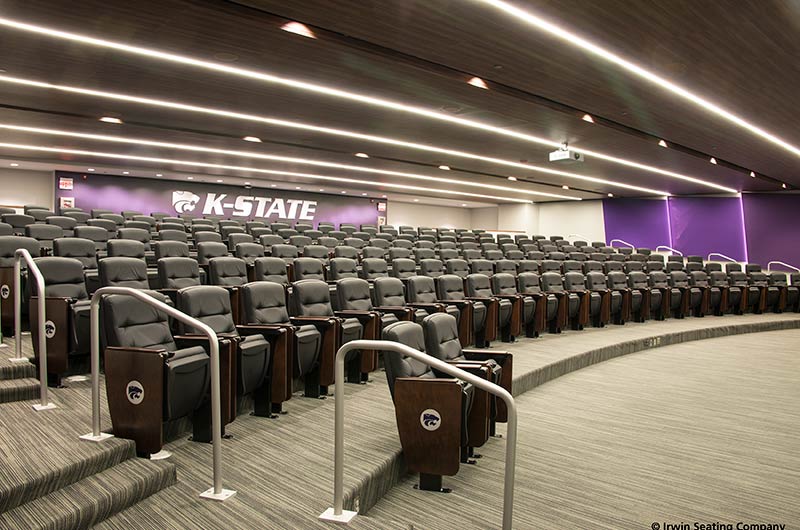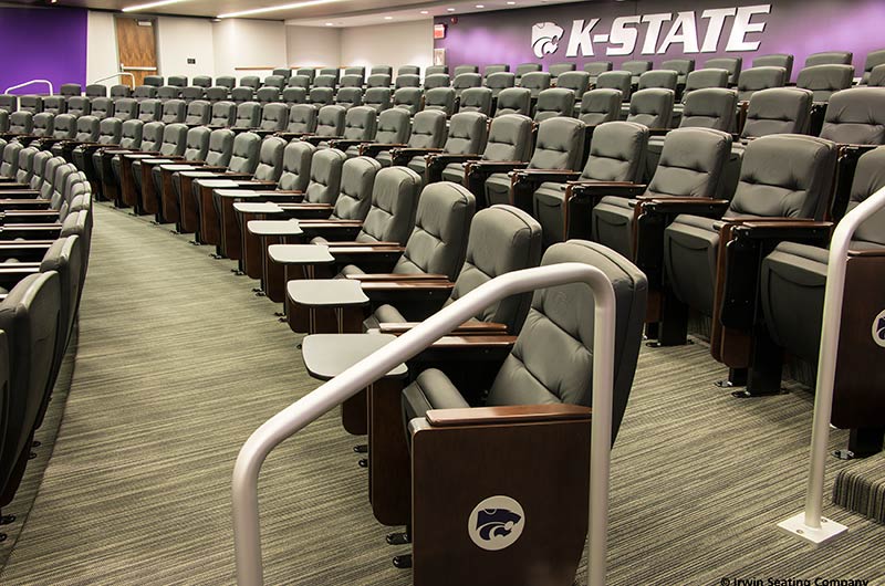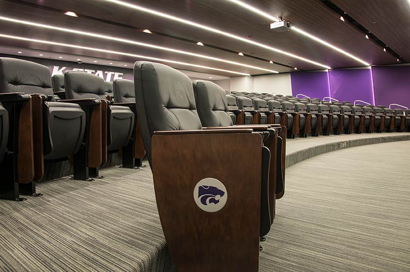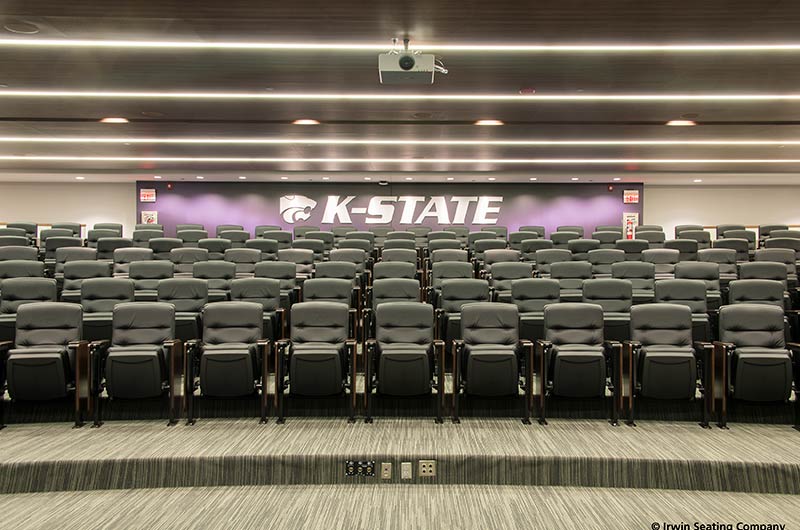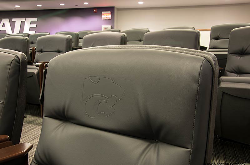 The Kansas State University Varnier Football Complex includes a 174 seat film room with individually mounted 71.12.79.149 Signature chairs. This model was designed to accommodate larger athletes with chairs that are 3" higher than a standard chair, they are also wider and deeper than most chairs. The seating here is upholstered in CMI Illusion black vinyl, end panels and armrests are finished in No. 24 Classic Walnut on Maple stain. In addition, the aisle panels are inset with a 5" screen printed logo plate and the backs are provided with a debossed logo heat-pressed into the vinyl.