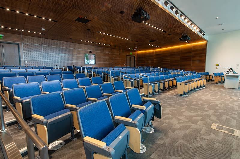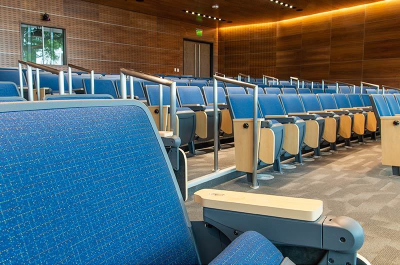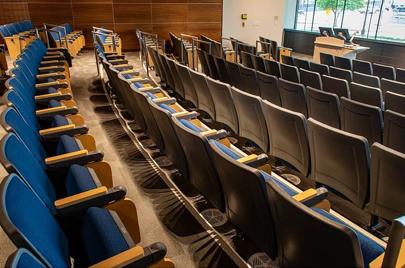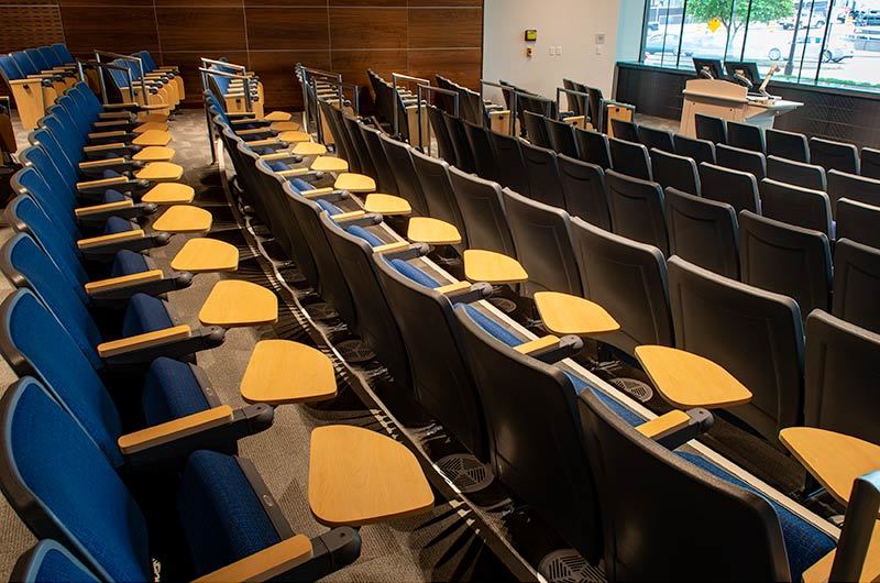 Virginia Commonwealth University's new College of Health Professions is set to open for the 2019 Fall semester. This building includes a beautiful 157 seat auditorium with Model 90.12.86.4 Citation from Irwin Seating Company. The seating was provided with 120 square inch writing tablets and LED aisle lights. Armrests, aisle panels and writing tablets are surfaced with Nevamar Clear Maple laminate, plastic and powder coat is Charcoal Grey and the fabric selected is Guilford of Maine, Couture, Tailor.