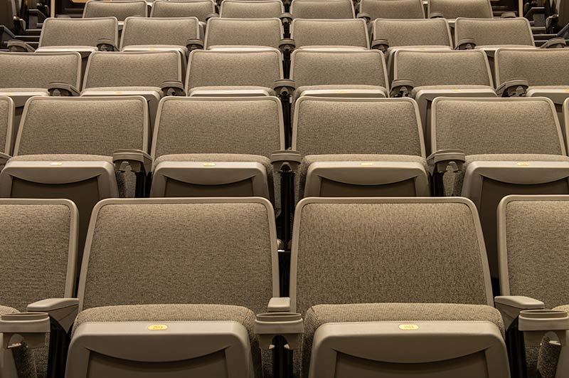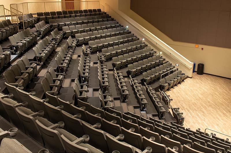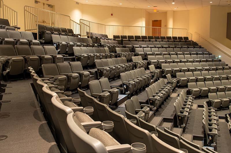This 273 seat auditorium in Virginia Commonwealth University's Student Commons Building was upgraded in 2019 with Irwin Seating Citation chairs. Model 90.12.00.4 shown here was provided with comfort curved polymer arms, cupholders, LED aisle lights and contemporary "open" aisle end standards. The chairs are finished with black powder coat (paint), Cadet Grey plastic and Absecon Mills, Shire, Aqueduct fabric.