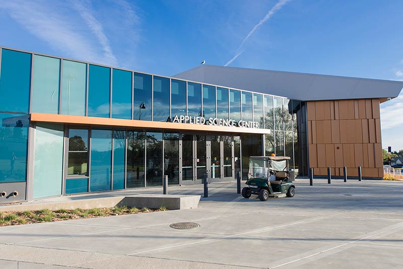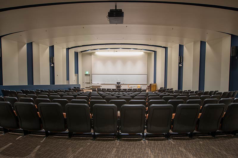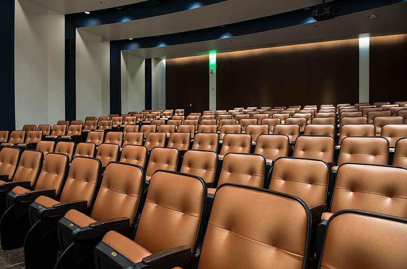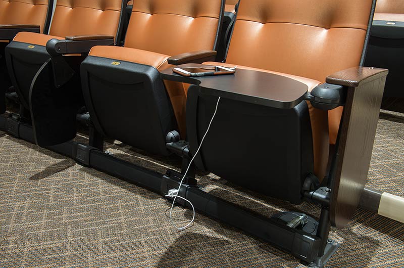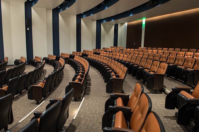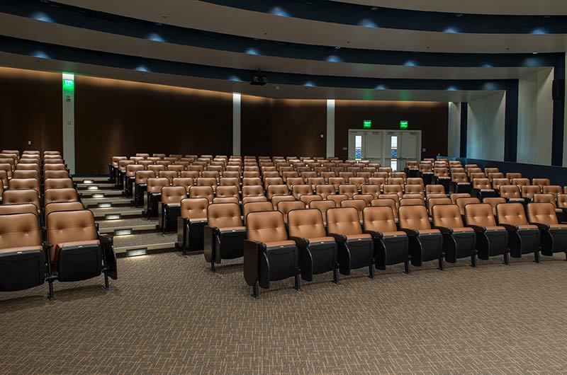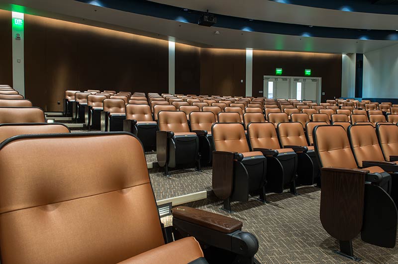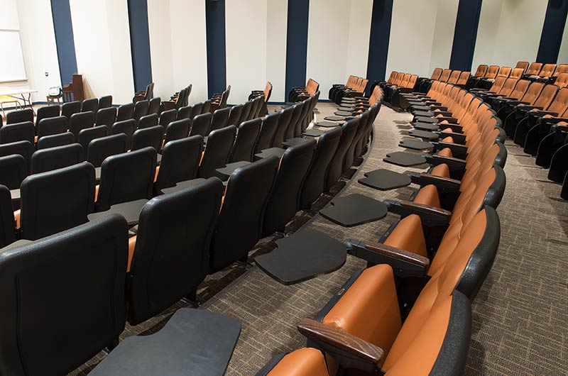 The new Applied Science Building at Venutua College was built with a large 204 seat lecture hall. Model 51.12.66.4 Marquee chairs were provided with a mix of 21" - 24" wide chairs and extra-large 151 square inch writing tablets. Irwin Seating's E-Link power/data system was also installed. Seating is finished in black plastic and powder coat, No. 24 Walnut on Red Oak stain for comfort curved arm and aisle end panels. The chairs are upholstered with Designtex Metta Ginger fabric.