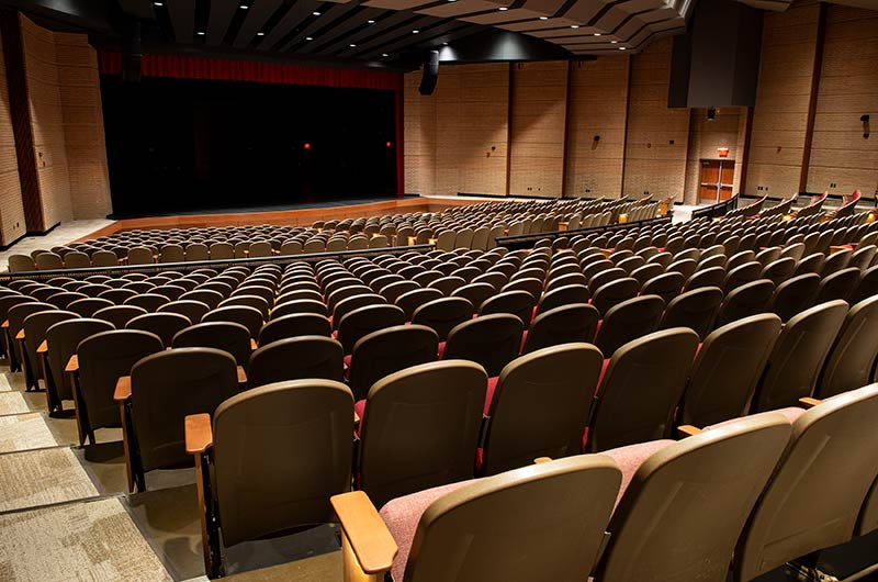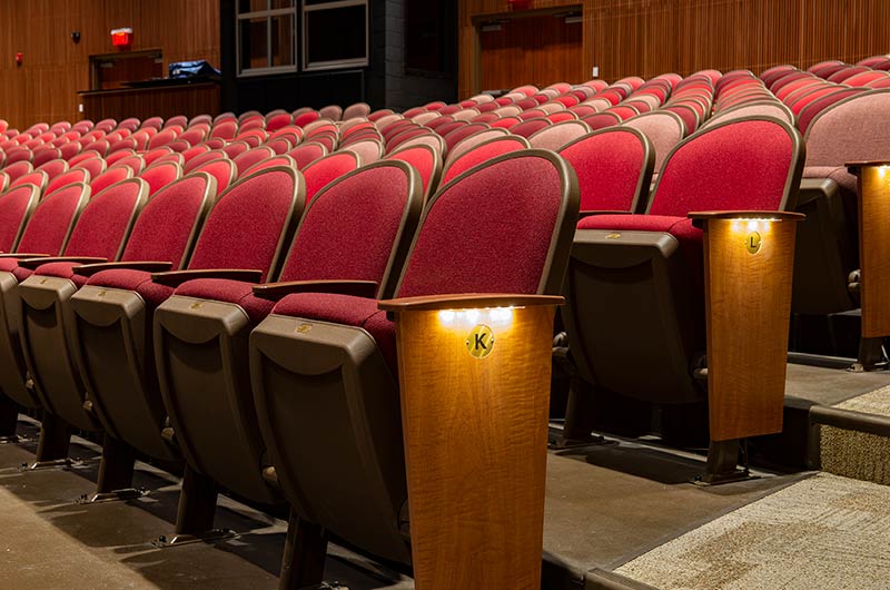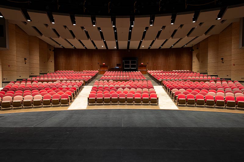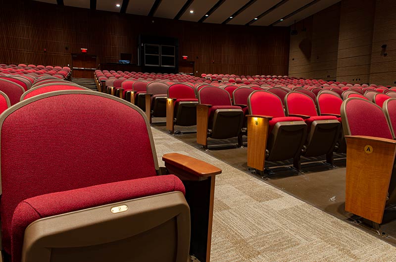 Weiss High School opened in the fall of 2017 with a beautiful auditorium installed with 781 model 91.12.86.4 Millennium chairs from Irwin Seating Company. These chairs were 100% manufactured in the United States and feature comfort curved solid hardwood arms, veneer surfaced aisle panels, concealed LED aisle lights and row letter/seat number plates. The seating was finished with Bronze plastic and powder coat (paint), No. 17 India Teak on Maple and upholstered in three shades of red Absecon Mills Shire fabric for a stunning effect.