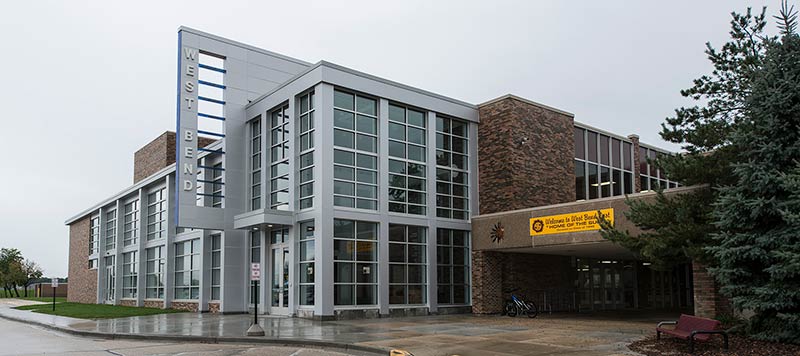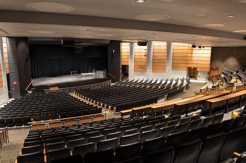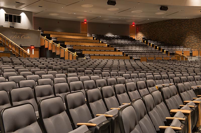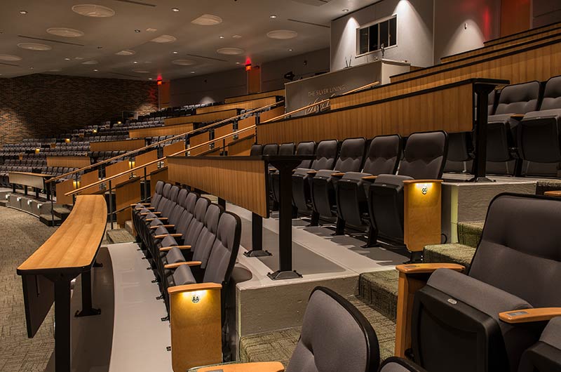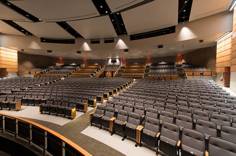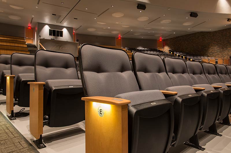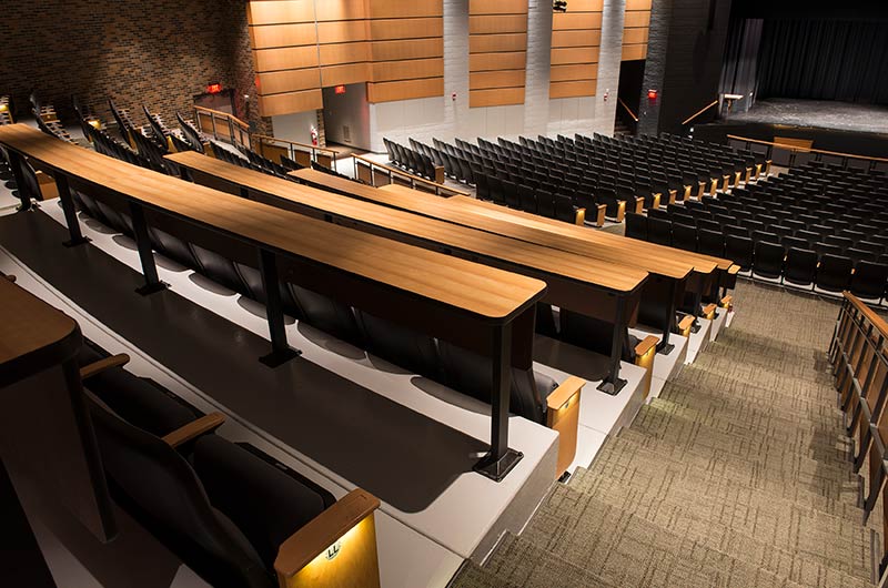The West Bend East and West High Schools share a campus and a large auditorium with 1,068 model no. 51.12.66.4 chairs and 12 strip tables provided by Irwin Seating Company. Chairs are upholstered with Designtex Wren Slate fabric. Other finishes include a custom wood stain on Maple, black plastic & powder coat (paint) and Formica Planked Deluxe Pear laminate.